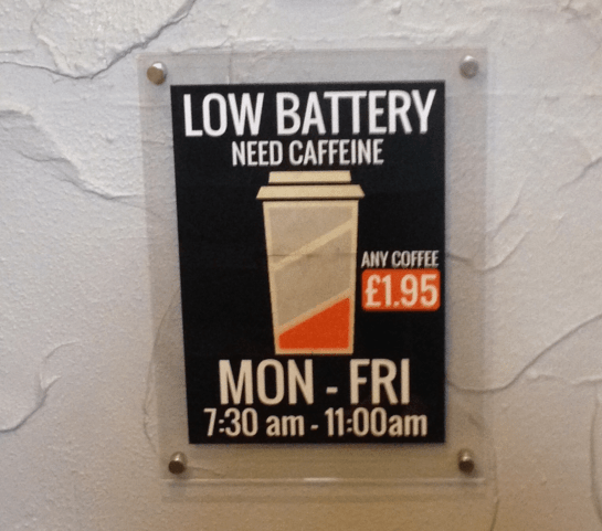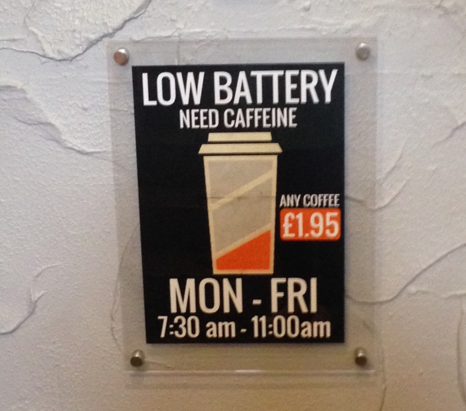 One last thing… I noticed this sign on the way out the door. I thought this was a pretty sweet deal, if I worked near here this would be the perfect excuse to fuel my coffee habit!