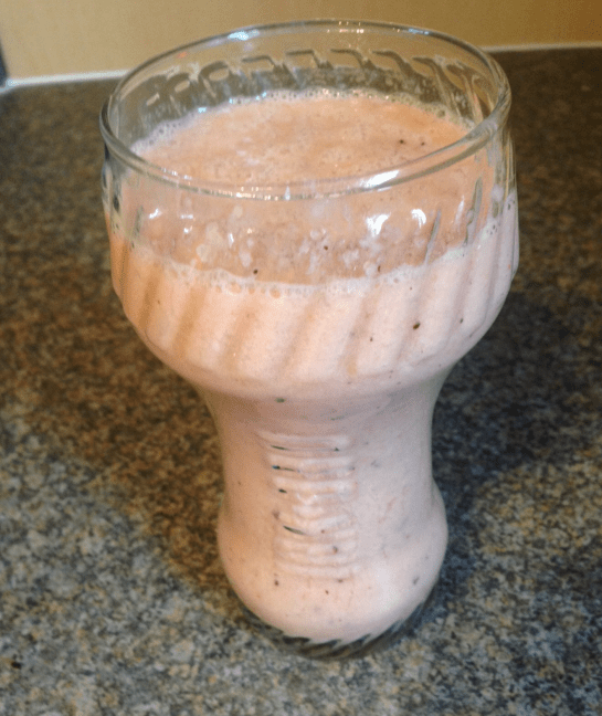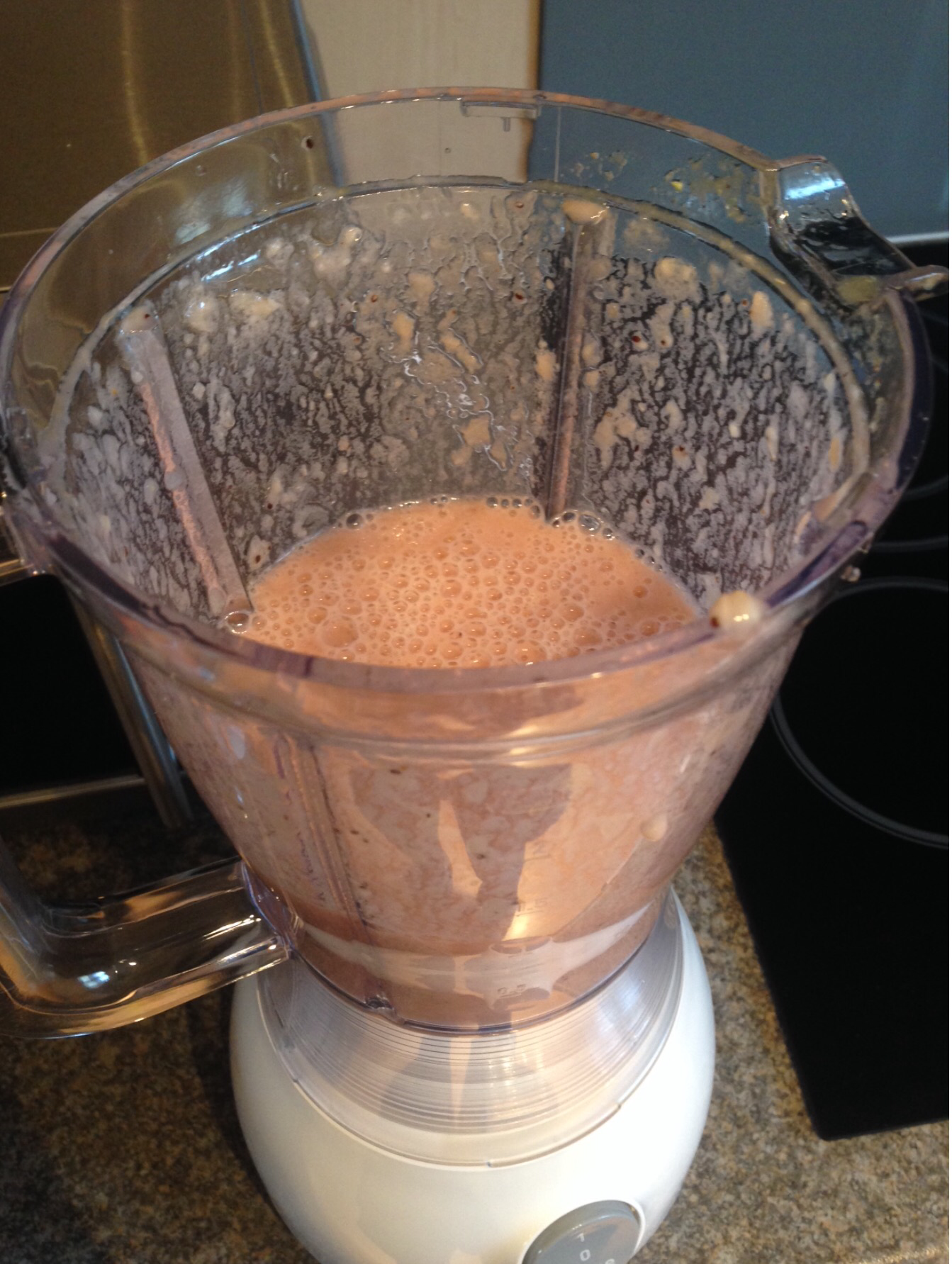 I peeled and grated some ginger until it was of a minced texture, the benefits of ginger are that it helps your body absorb nutrients and clears your sinuses which is exactly what I needed! I have a hand blender that I purchased for £5 from a supermarket value range which does the trick when blending fruit for a smoothie. However my boyfriend was given a blender for free so we thought we’d try it out for the first time.