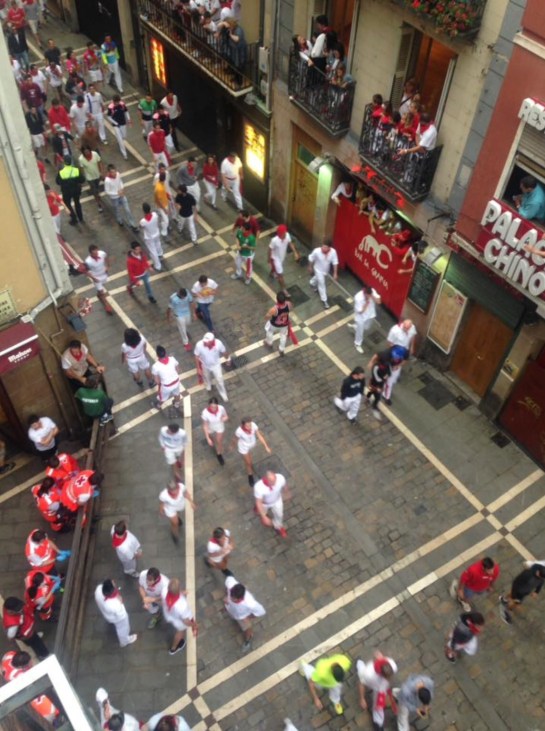 So Gav and I got in on the action and rented a third floor balcony to watch the running of the bulls unfold. I got my knickers in a twist a bit before we went on holiday as I had a feeling that if I didn’t get a balcony before I went then I wouldn’t be able to acquire one. However I was a bit wary giving my card details to someone unknown on the Internet. It couldn’t have been easier though as our hotel had contacts with people renting out balconies so we inquired and paid for the balcony at the hotel the day before. It was €65 each for approximately 2 hours use of the balcony. You can pay more, I had quotes of about €100 and for that you were getting full commentary and knowledge about the annual event in English with breakfast provided. However for our 65 bucks we got a cup of coffee, a packaged sweet breakfast item and we met some American guys having a boys trip away to Pamplona, they’d been up all night partying which seems to be the thing to do! You don’t get exclusive use of the balcony for your money, you get space to see and there was about 10 of us watching which really added to the atmosphere as you can make new friends like we did. We had to be there before 6:30am as the bull run begins at 8am and they shut off all the streets to those not running. You can see behind the wooden barricades but it’s crowded and a bit of a long uncomfortable wait by the looks of things.