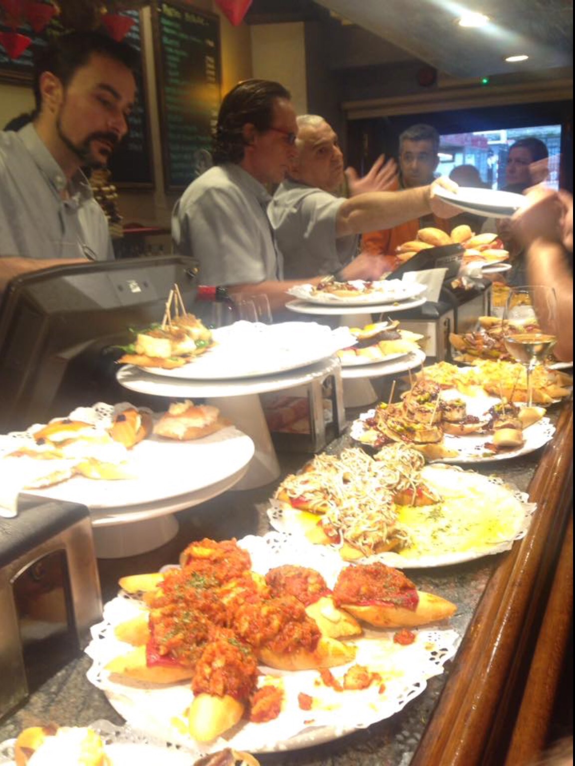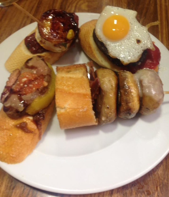 Pintxos is the Basque word for tapas style eating – it really blew my mind the way that they eat here. You are encouraged to go into a bar, order a drink and some light nibbles. It seems anytime you feel hungry there’s food there which I love as I always feel like I could nibble on something when drinking. We were in Plaza Nueva, which is a large square in the old town where lots of people congregate for the best pintxos, so we did too and above is a few of the samples we had. We went to about 3 or 4 bars and made it our dinner, it was difficult to find a sit down restaurant and it felt like we were taking part in the culture by eating this way. It’s definitely a unique approach, they heat food up in the microwave if you want it hot, I’m not sure I’m crazy about this idea but I’ll keep an open mind until we get to San Sebastián which is described as Spain’s foodie capital. We stumbled upon a series of restaurants later on in the evening so it’s good to know you have the choice.