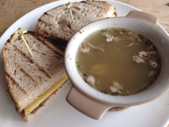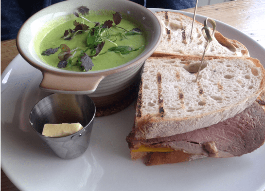 Lunch was divine, there’s no other way to put it, we both opted for the soup and sandwich combo, albeit different soups and sandwiches. I had the Chicken & grains soup with a cheese and apple chutney sandwich – the cheese was thick and the chutney sweet and the soup was homemade goodness with big chunks of chicken. Gavin had the pea and mint soup, what a glorious colour it was – bright green and beautifully garnished with a roast lamb sandwich with mint pesto. Good quality bread, slightly toasted, lunch was both filling and delicious.