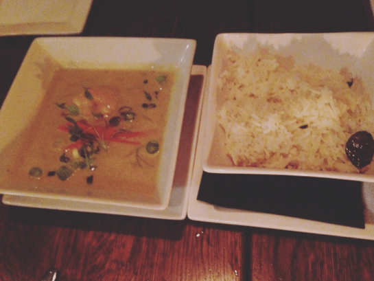We opted to order some bites to share for starters and went for the crispy haggis bon bons with whisky marmalade, the Gyoza goats cheese with carmalised onion balsamic dip and roast pork gyoza with wasabi cream – a gyoza is a type of Chinese dumpling they were both delicious and I loved the contrast of flavours served on the one plate, the balsamic was particularly nice. Someone in our party fancied the spicy Thai green king prawn curry for starters too which we were recommended to have with the steamed Thai rice. The food was flavoursome, vibrant and creative, by the time we’d nibbled all the starters we were all psyched up for our mains!