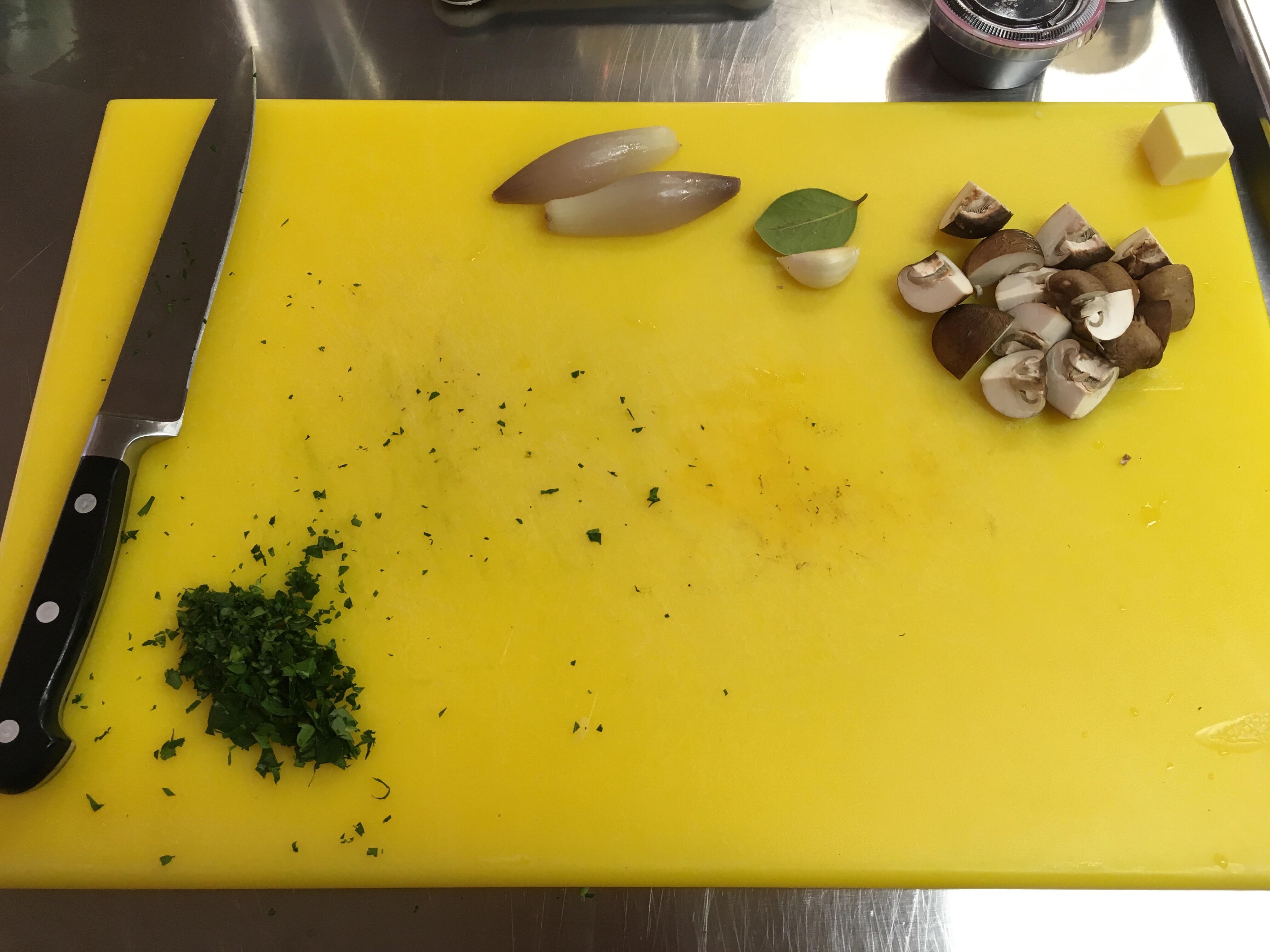 We were tasked with prepping our vegetables for the Bourguignon sauce. Once the steaks had been cooked to our liking (we tested this by using a temperature probe, with 45 degrees being the optimum temperature for a medium steak) we were to rest it. We added shallots, mushrooms, a bay leaf, pancetta, a clove of garlic, red wine and chicken and beef jus to the pan and reduced it until it started to thicken.