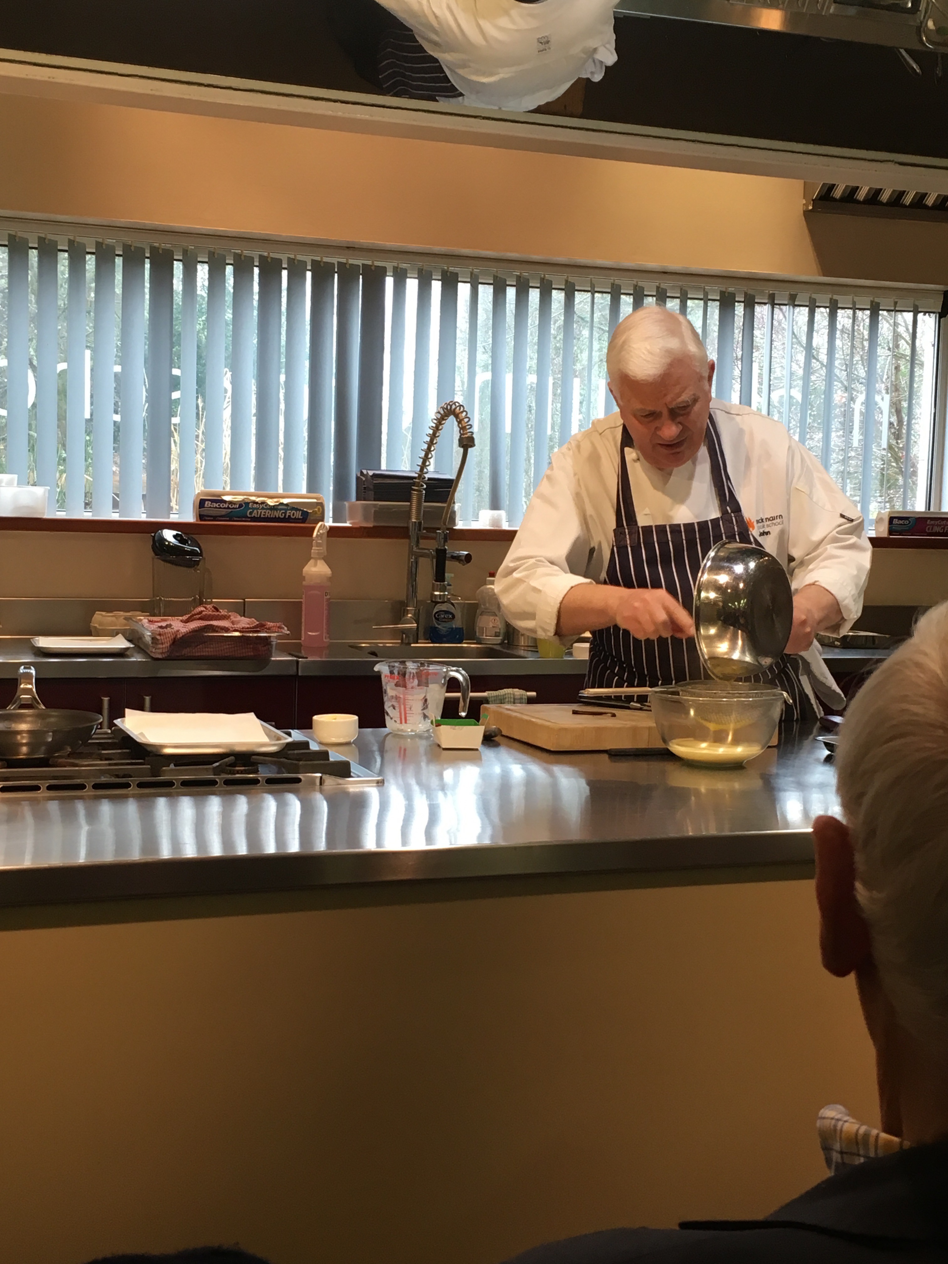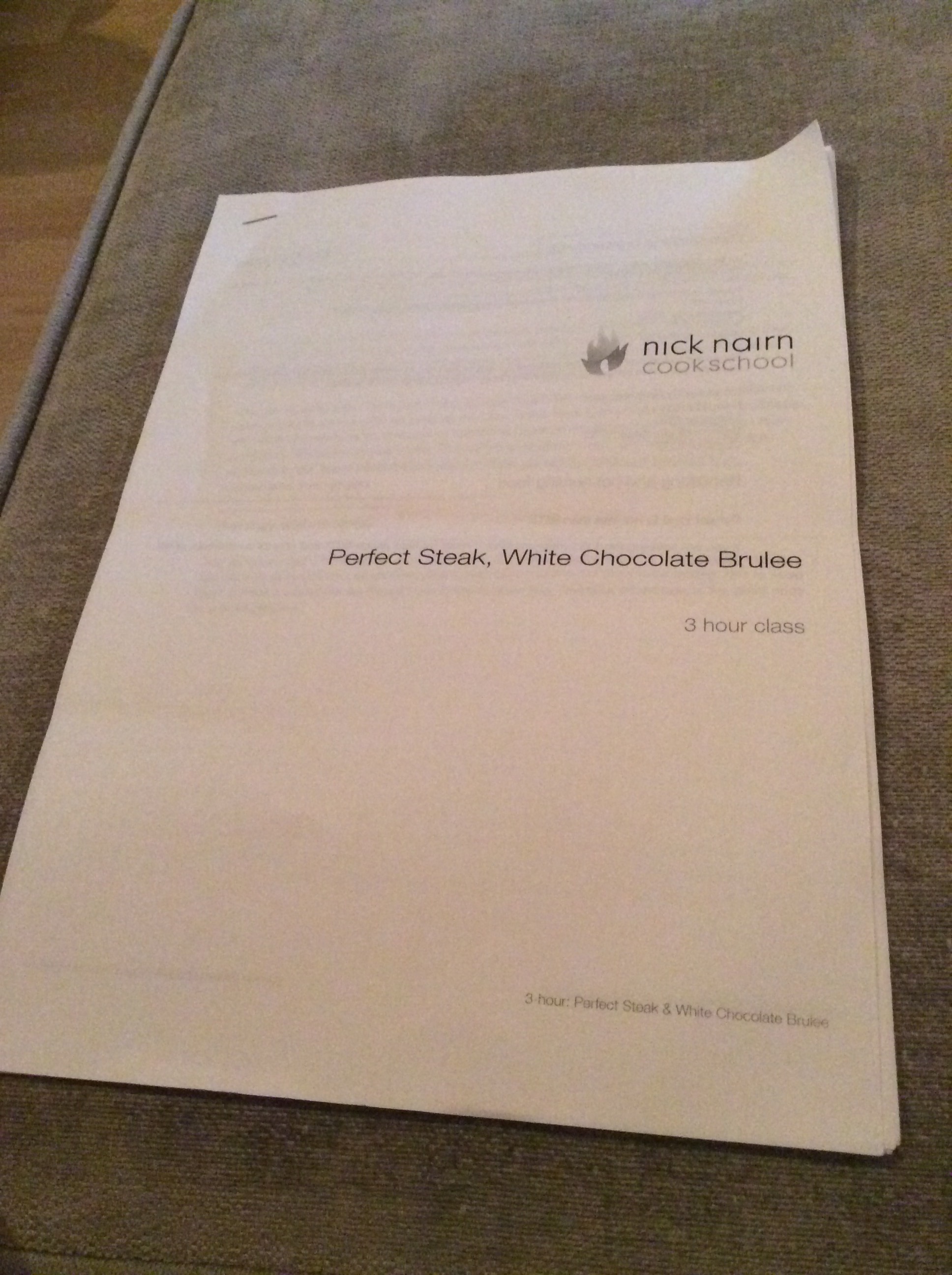 I made friends quickly and I was surprised by how big the class was, more males than females in attendance and a good mix of ages, some people had come with a friend or partner and some had come alone like me. John welcomed us into the kitchen and we sat on some stools and watched him demonstrate the brûlée and steak dish. We were given recipes and tips to take away with us.