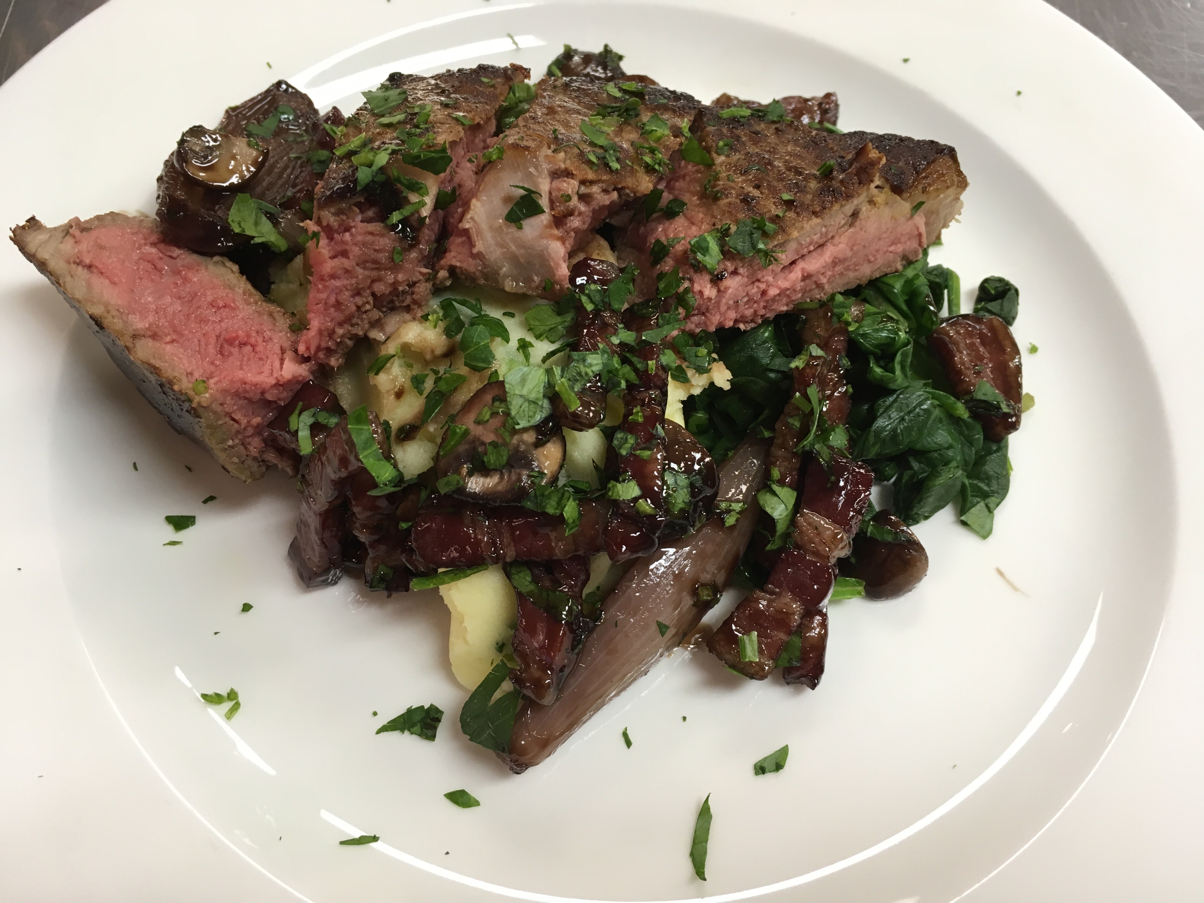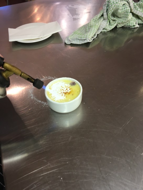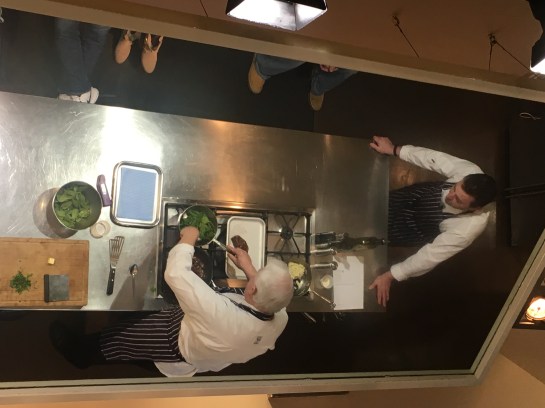 The demonstration was very relaxed and John answered any questions that we had. We were able to see everything that was going on by looking at a mirror directly above John’s head. Alex was John’s sous chef. We were not going to be making the brûlée, we were shown how to do it and it had been prepared for us, we got to use the blow torch to caramelise the top. The steak however was our task for the day. We were to work in partners to put the final touches to the mash that had been pre-made for us, by prepping and adding spring onions, butter and cream, we were also to wilt the spinach as a partnership.