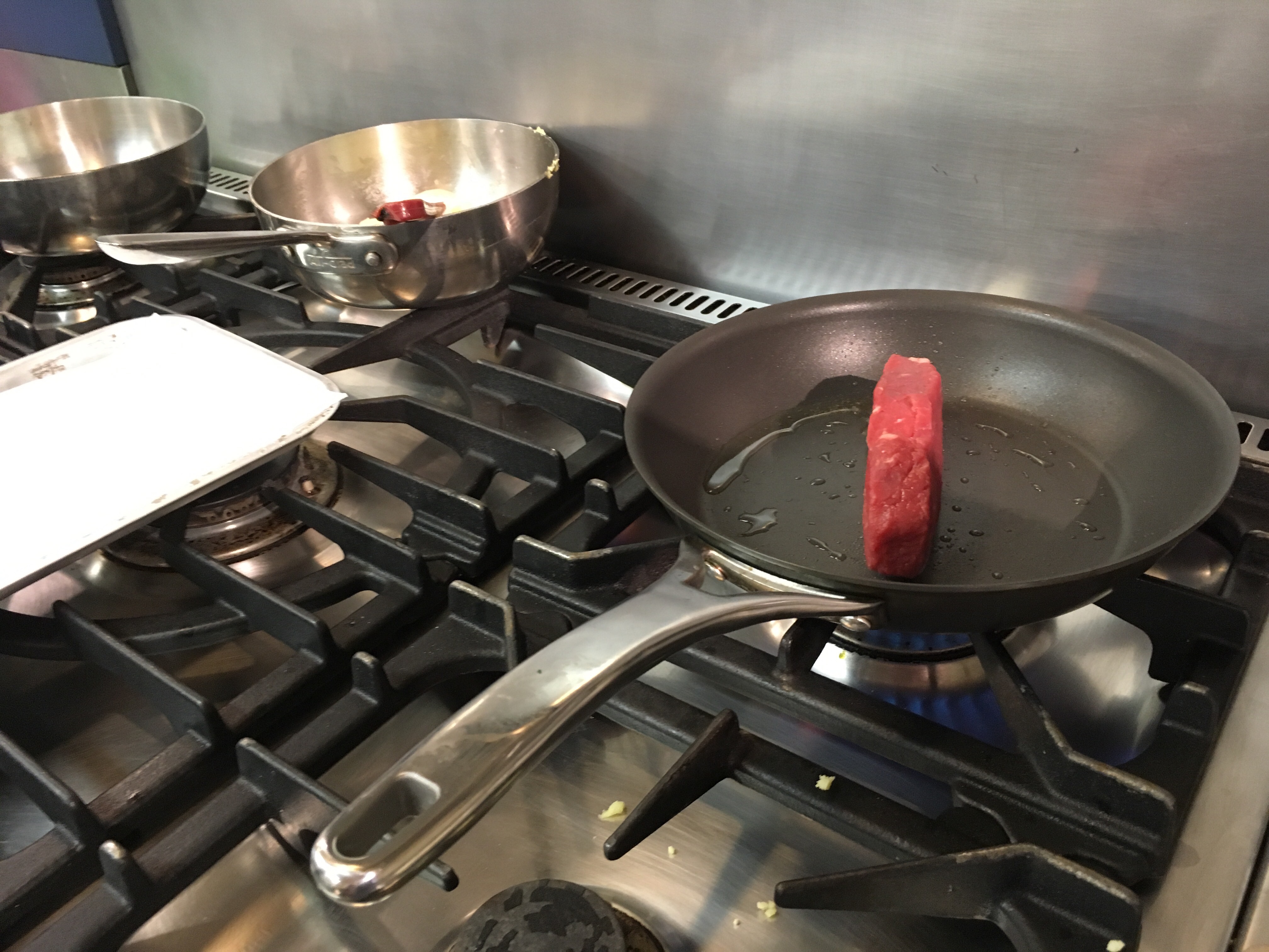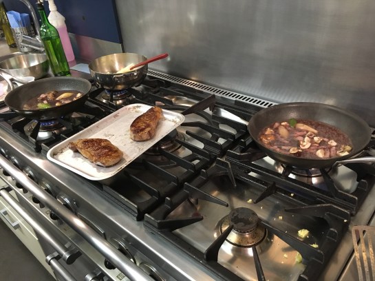 My partner was Douglas, his wife had bought him the experience as a Christmas present too. He was up for taking photographs of the whole cooking process as well which was great for me! The steak was to be cooked in a hot pan which we tested by splashing some water in it and waiting for the sizzle. We started by cooking the side of the steak that had the strip of fat on it first.