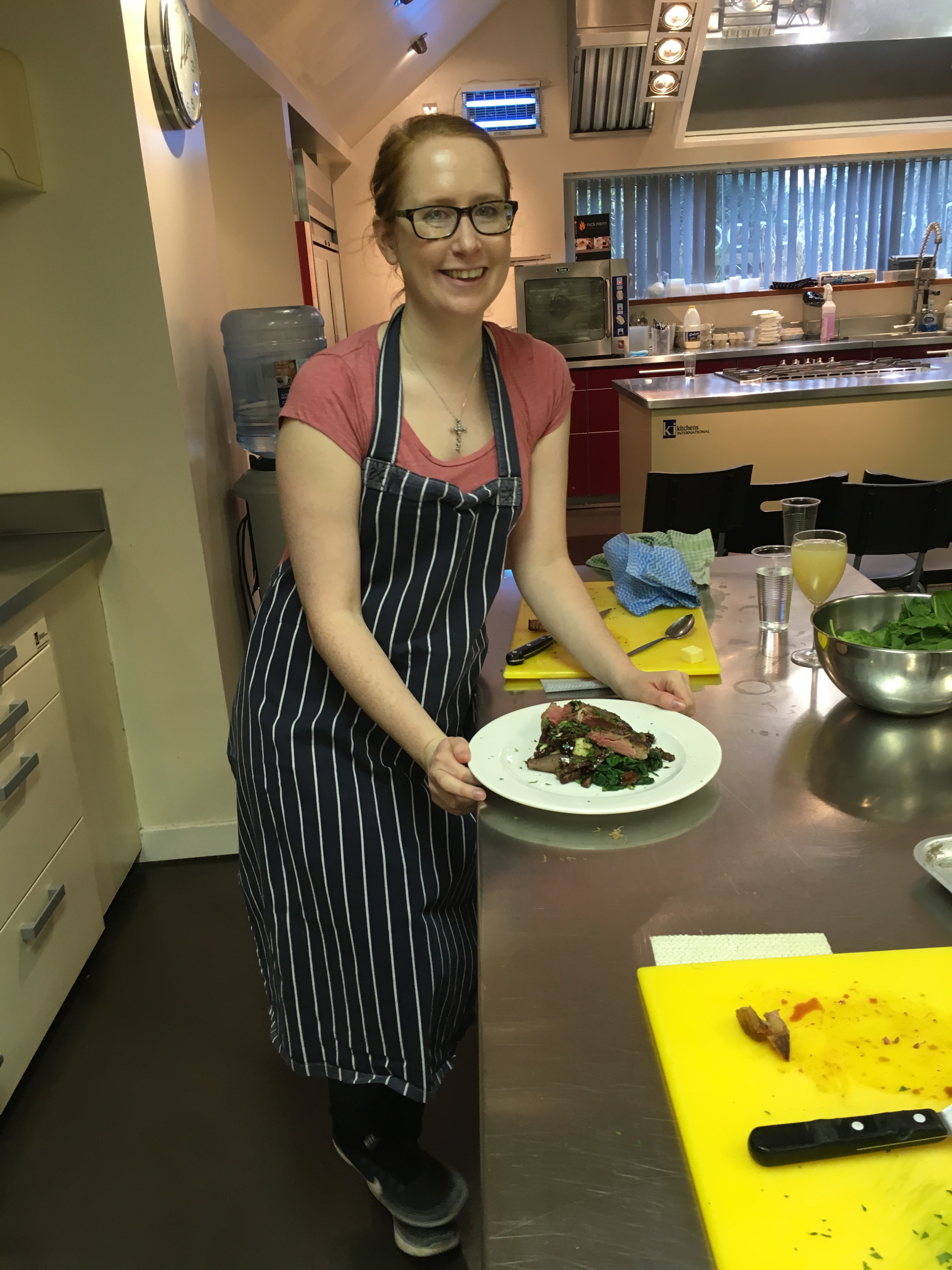 Plating up, we placed the spring onion mash and wilted spinach side by side and scored the meat to allow the jus to seap through, before garnishing with chopped parsley. We then went to the dining room area where we ate together with wine if we so wished (unfortunately I was driving) or apple/orange juice. It was such a lovely atmosphere and while we ate, all our dishes were being cleaned for us!