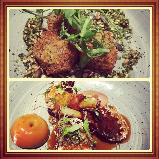 I ordered the porcini mushroom arancini with lovage pesto to start and Gavin went for the crispy duck wings with plum, hoisin & sweet chilli glaze, roasted plum and toasted sesame seeds. It was so hard to choose which starter to go for as there was so much varied choice from scallops of the day to deep fried Somerset Brie.