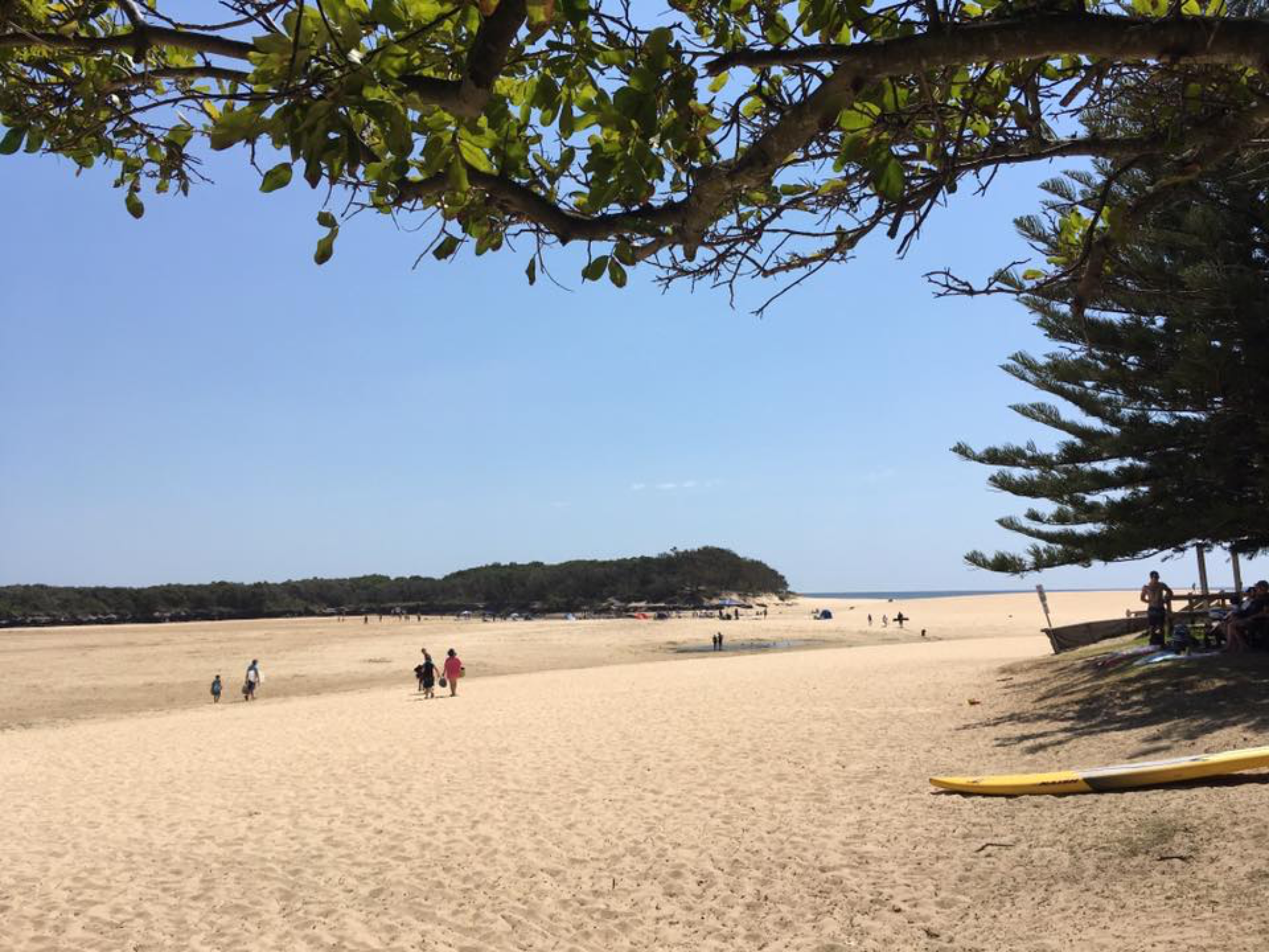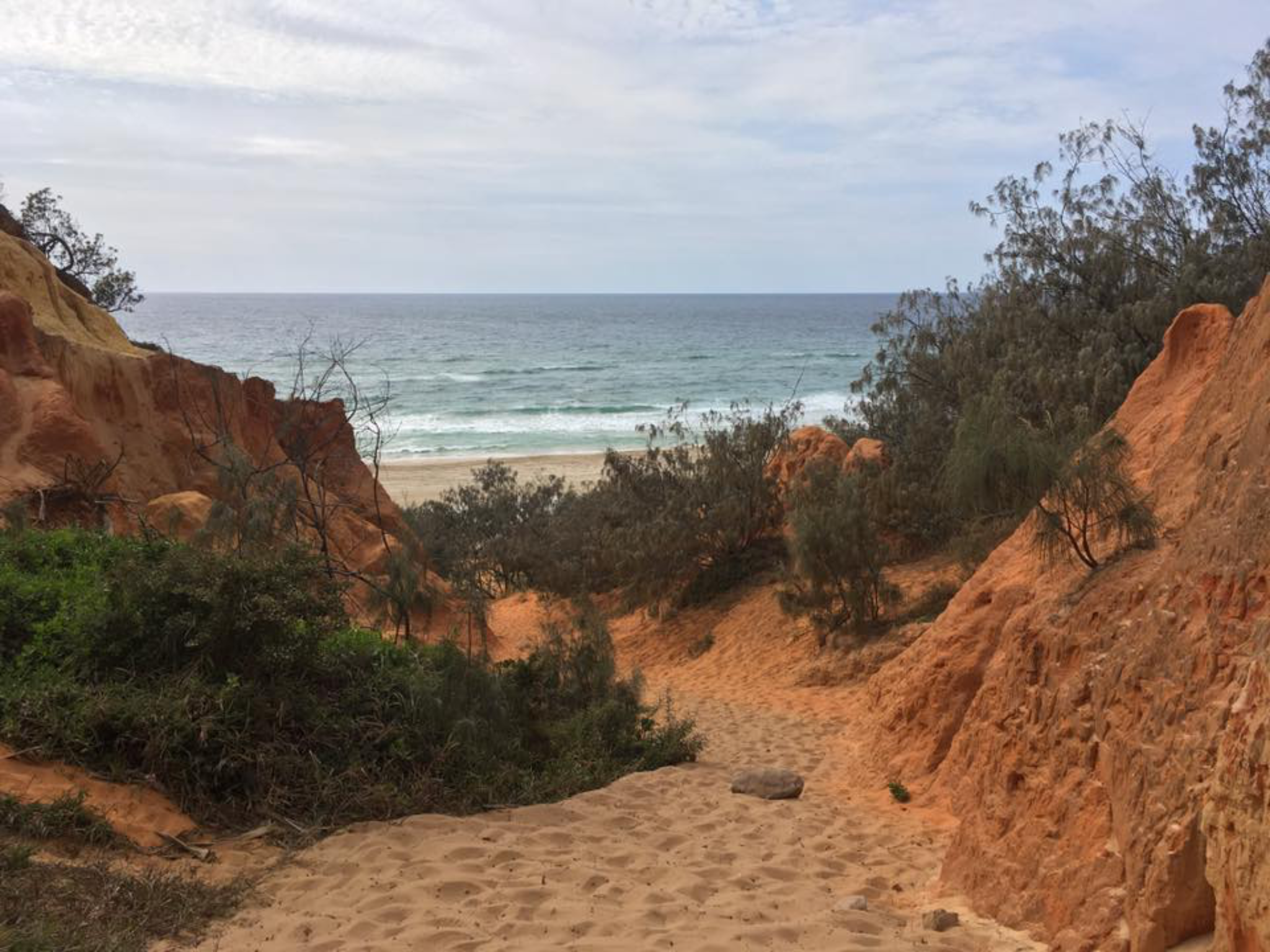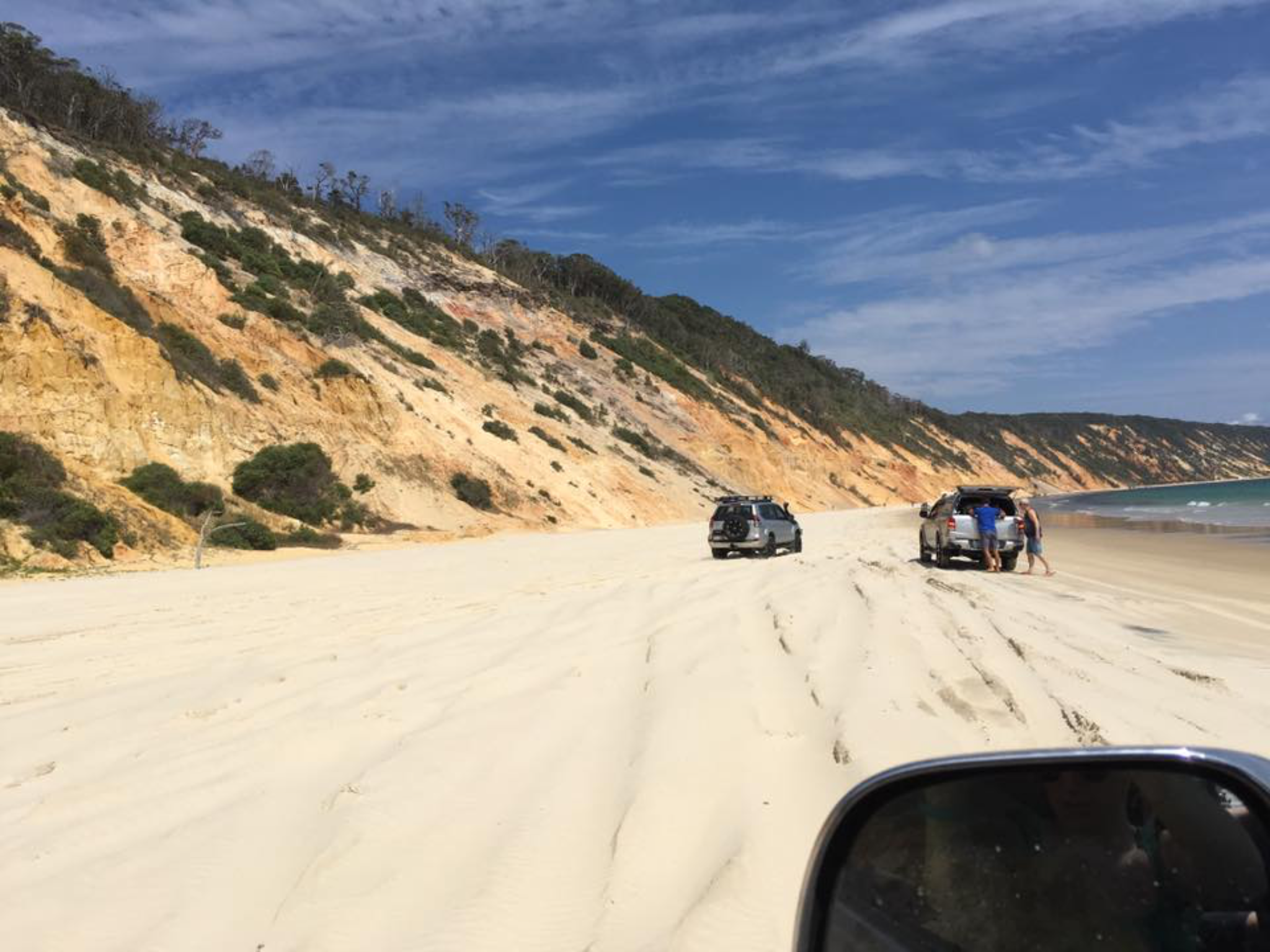 Hannah did a great job navigating the tracks on the beach in the 4X4, she said that she used to go as a child and recently with her brother. We arrived at a section of the beach called Red Canyon and we walked up to the top in our bare feet which made them look tanned as the sand looked like a rusty red colour. Once we were back in the car, Hannah warned us that we might get ‘bogged’ – stuck in the sand. There were a lot of 4WDs attempting an incline of sand in order to get to another beach and a lot of people were getting ‘bogged.’ We went for it and ended up getting stuck as someone stopped in front of us. Then someone beside us got stuck. You can put grips under your tyres to get out but it wasn’t helping. Luckily, a man we’d helped out of his bogged situation earlier, came and helped us and we were released. The whole day was action packed and a fab new experience. We went swimming in the sea and had some drinks on a deck chair. We had a lovely lunch at Rainbow Beach in a cafe there and we saw lots of people camping along the beachside. Hannah and Alex kept an eye on the time as we had to be back before the tide began coming in and it was hairy at times when other drivers were going too slow or coming too close to our 4X4. We finished the day with a Beefy’s pie which tasted amazing!