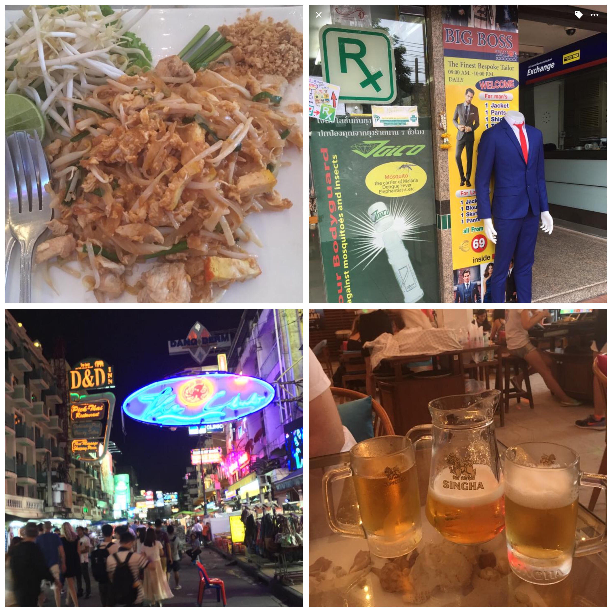 Our hotel was really welcoming and they immediately handed us some fruit juice, copied our passports and assisted us to our room. Quite tired, and knowing it would get dark soon, we quickly showered and freshened up with the aim of doing some wandering. We happened to be located just 8 minutes walk from Khaosan Road, so we did what any 30 year old backpacker would do and headed there to see what all the fuss was about. Lined with the big chains we were used to seeing back home – McDonald’s, Starbucks and Boots, we were hassled with questions about whether we wanted a tuk tuk and Gavin had salesman after salesman approach him about whether he was interested in buying a suit! We walked the length of the road and halfway back, settled into a very open and airy restaurant with live music. A lot of the restaurants have the same open feel environment. We immediately ordered a jug of Singha and the cliché Pad Thai and Thai green curry. The food was very welcoming after having travelled for almost a day. We then headed to a nearby bar still on Khaosan Road, which had different levels and again was very open and airy with fans blowing cold air all around. We both had cocktails – me a piña colada and Gavin a mojito. After that we wearily headed back to the hotel and we were in bed by 8:45pm! Jetlag had caught up with us!