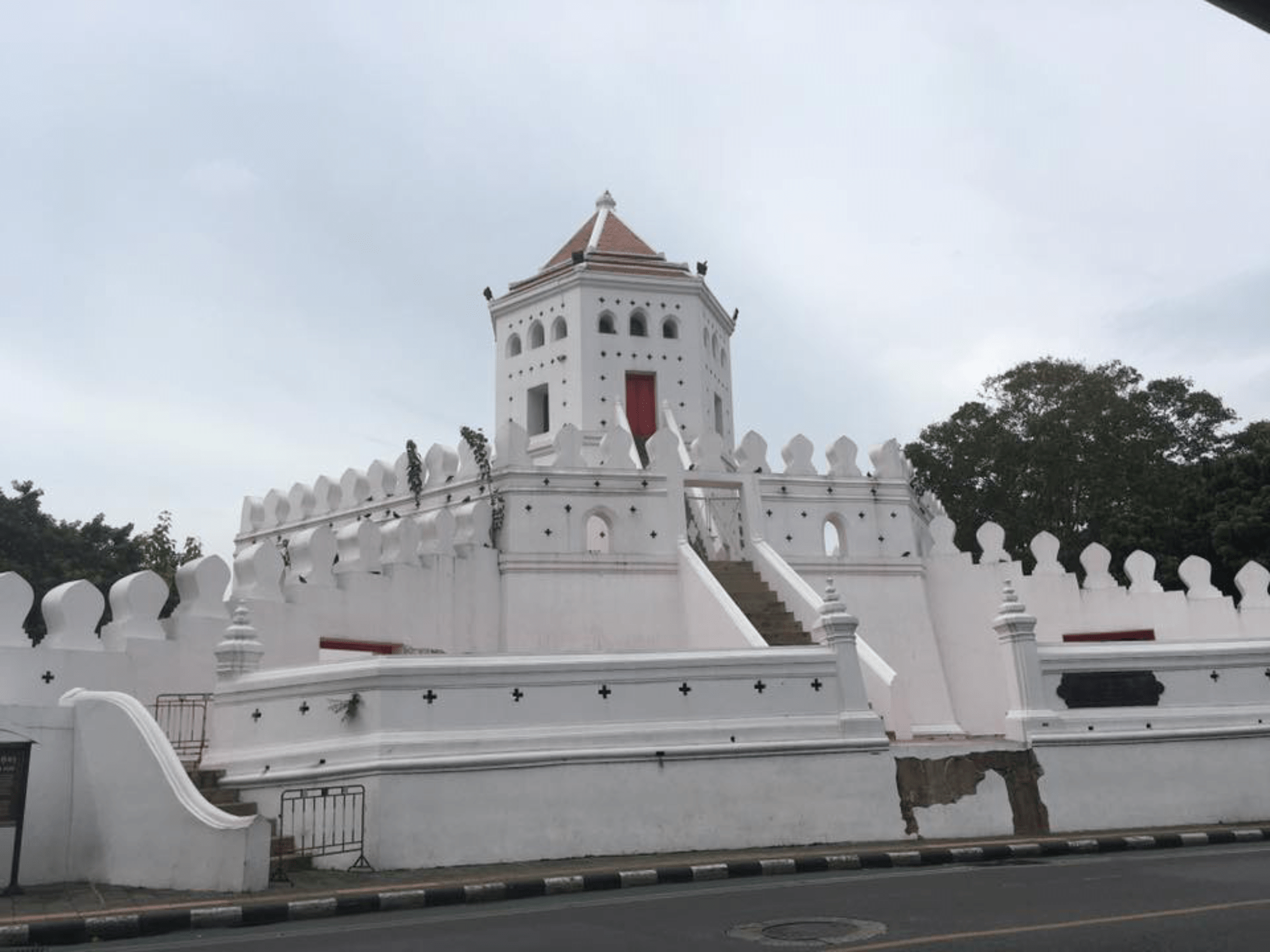 Getting up this morning was difficult. We slept for about 15 hours and therefore didn’t start our day until about 1pm! Hungry from being asleep for so long, we headed back in the direction of Khaosan Road and ended up on a street not too far away with similar open airy seating to the night before, which looked appealing. I really wanted some ‘typical’ breakfast, I wasn’t keen on rice or noodles at that time of the day (even though it was lunch time), so I opted for the eggs skillet which was tomato based with red onions, baby corn and two fried eggs. Gavin opted for a chicken noodle dish. When the dishes arrived I felt a bit disappointed to find large noodles in with my eggs but nevertheless I gave it a go, I’d also been given toast and jam and the jam tasted like the very sweet jam you find in an empire biscuit or strawberry tart. I’d ordered an iced coffee to wash it all down. We sat and people watched for a while then had a wander down the narrow streets to browse the shops. We then came across the Chao Phraya river and the Phra Sumen Fort, built in the reign of King Rama for ammunition and weapon art storage. We had our first Thai foot massage in the narrow streets of Bangkok which was so relaxing, if not sore at some points! We proceeded to walk back to the hotel for a dip in the refreshing hotel pool before our Intrepid meeting that evening.