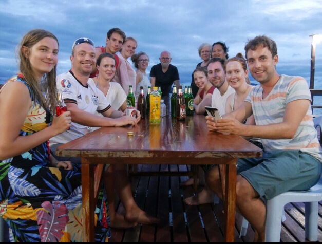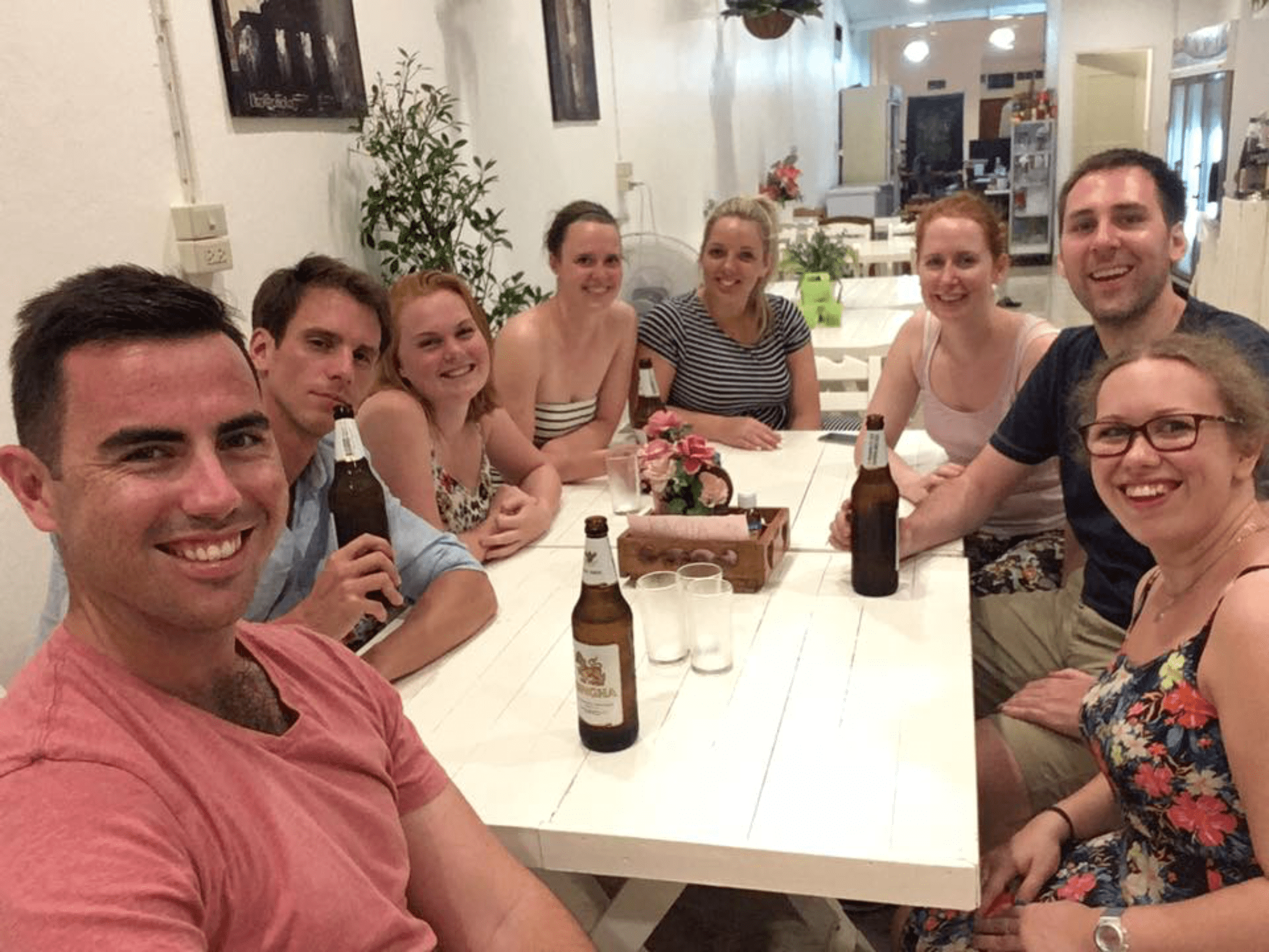 After returning the bikes and another short tuk tuk ride back to the hotel, we all headed to the pool to cool off. Sarah, Anna and Freddy asked if I fancied going for a foot massage and it didn’t take much to persuade me. I felt so relaxed from the massage that I fell asleep and woke myself up snoring! After a relaxing shower we all jumped on tuk tuks back to the local town and had a craving for western food. We spotted a little place that sold some, we ordered so much food ranging from cheese sticks, French fries, pizza and garlic bread as well as lots of Thai beer and cocktails. Alex used a selfie stick for the first time and got a really good shot of us all. We had a really good night comparing and tasting the ‘western style’ food. The garlic bread was by far the worst as it tasted sweet! When we left the restaurant there were no tuk tuks to be seen so Hannah negotiated a ride with some restaurant workers in the back of their SUV for 100 BAHT for us all. When we got back to the resort, we opened the adjoining door and had some beers and chat before bed.
