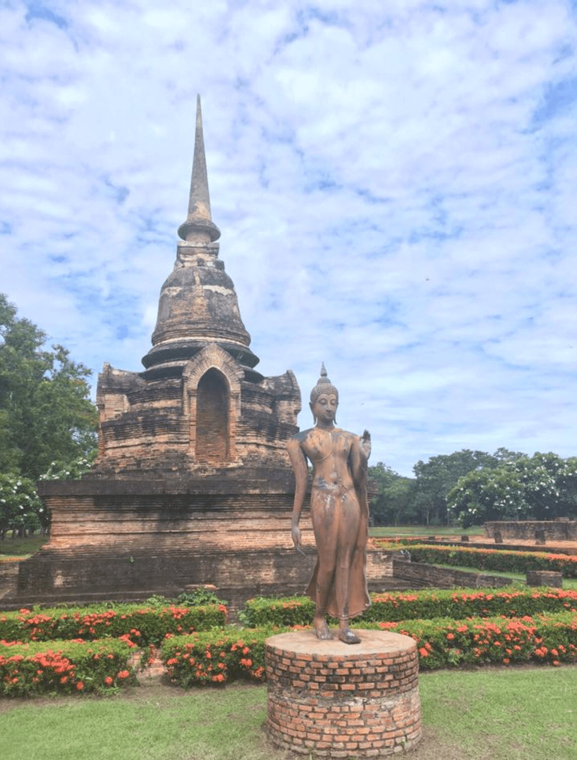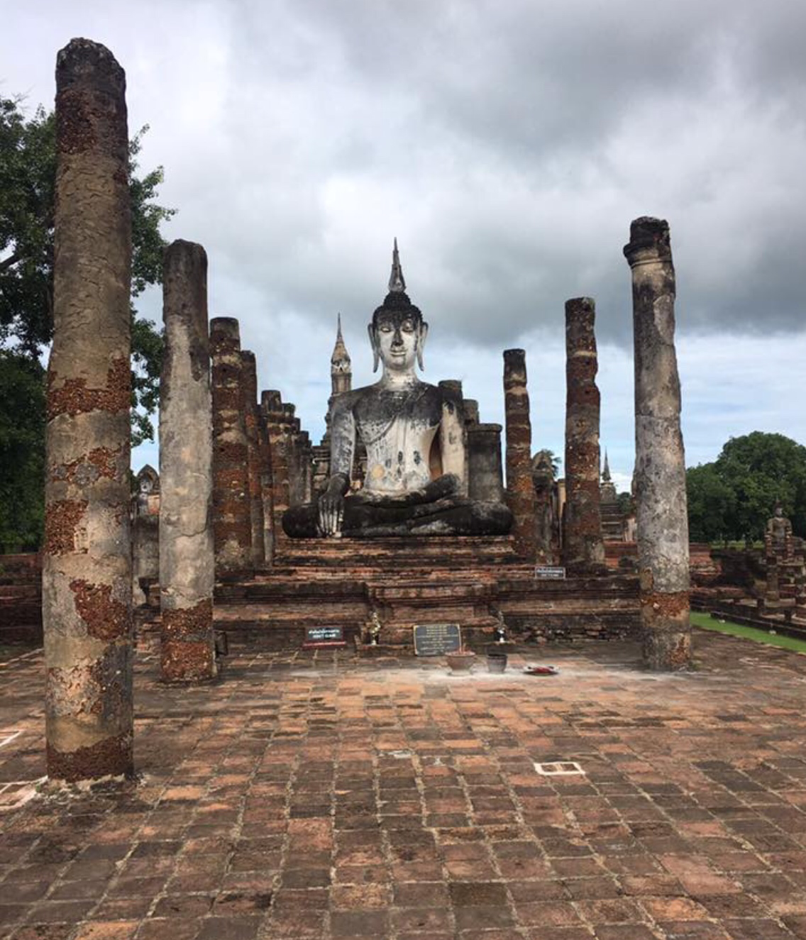 Today we had a long drive from the bustling city of Bangkok to Sukothai in Northern Thailand. We got some breakfast from 7/11 – A packet croissant, a frosty cereal bar and a chocolate milk, they don’t sell any fruit which is a shame as that’s all that’s missing! We got a mini van to the main bus station, where I was dreading the move into the main local bus, I envisaged feeling cramped and hot but I couldn’t have been more wrong! We were greeted by a very clean, spacious bus, where the seats stretched back and there were foot rests. Once the journey had started we were given a complimentary bottle of water and a banana cake which was lovely. The journey was approx 6 hours and I started my new book, ‘Big Magic,’ by Elizabeth Gilbert and read some magazines on my iPad. We stopped for lunch at a local eatery and I had a pumpkin and pork red curry which was a little spicy and not my favourite thing I’ve eaten so far. We arrived at the hotel in Sukothai at about 4pm, the place was beautiful and tranquil and we each had our own little bungalow as our room. We discovered that the Aussies and us had an adjoining door which came in handy later on in the day. I had a long, leisurely shower and we all met for dinner at the Sukothai Kitchen restaurant across from the resort. I had sweet and sour chicken and Gavin had a spicy pork curry, again the food wasn’t my favourite that day. After dinner we headed back to Alex and Hannah’s room for some Chang & Singhas that they’d went and bought via a tuk tuk to 7/11 before dinner, we opened our adjoining door and everyone else came over too and we had a really fun night laughing and chilling out chatting.