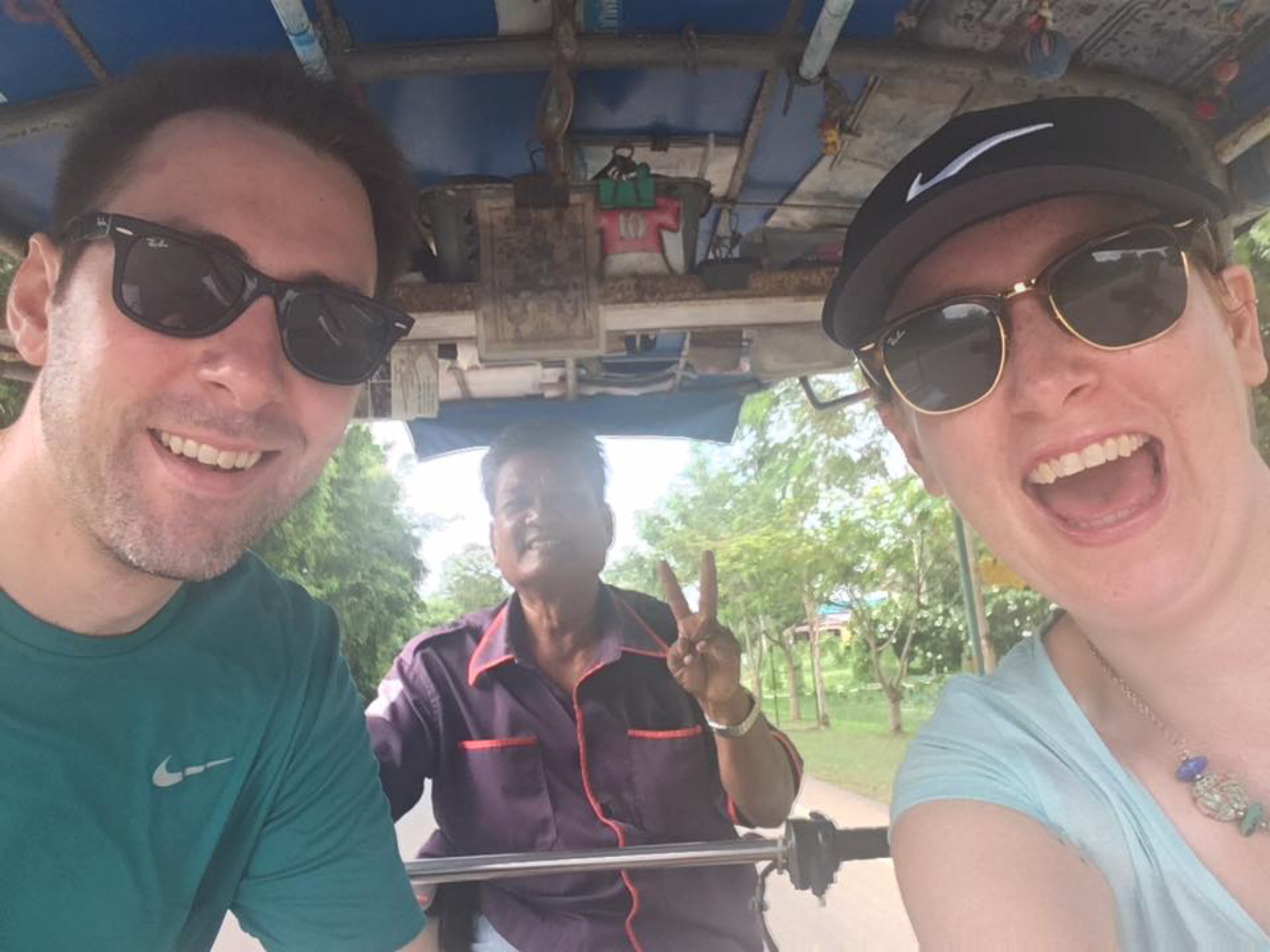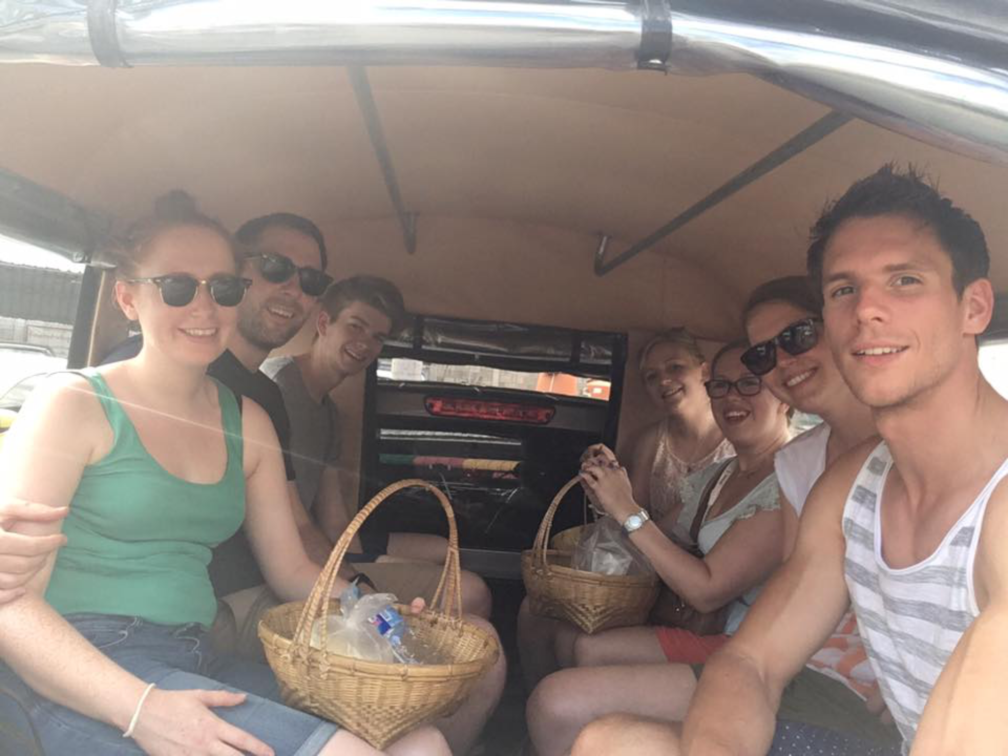 I slept like a baby last night, so far the mosquito spray is keeping the mozzies at bay as I only have one bite and it’s under my hair on my head! We had breakfast on the decking outside the breakfast restaurant, toast and fried eggs followed by some fruit and a mini banana muffin and two cups of tea (heaven) it was really nice. Nok told me that Thai people make a big pan of food and that is served for breakfast, lunch and sometimes dinner because Thai people hate waste and don’t like frozen food. We got the chance to ride in a tuk tuk for the first time which was so much fun because of the novelty and the welcoming breeze!