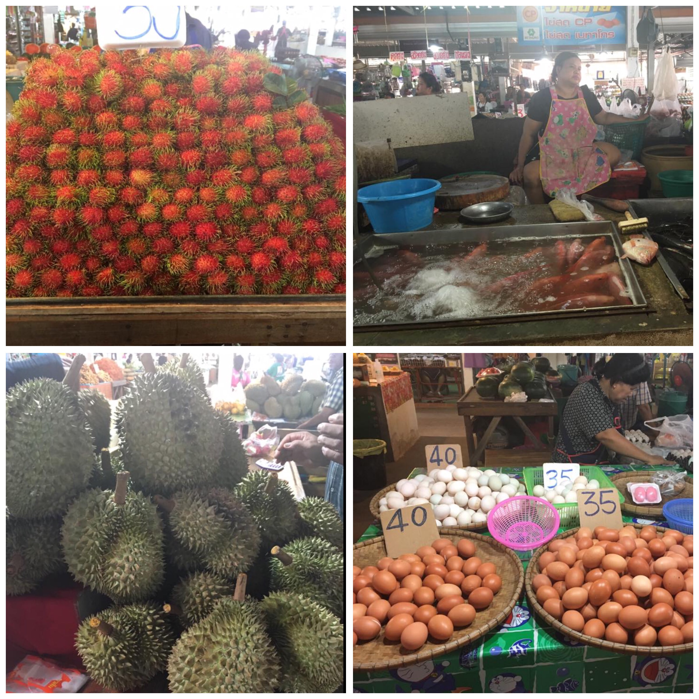 After lunch we thanked our hosts and cycled to a Thai food market where we got to try Rambutan and Durian fruit. Rambutan is often described as being similar to a lychee. It has a red and green spiky exterior and a soft white flesh with a stone inside. Durian is a bumpy, swampy green colour and it has a smooth custard-like taste with a similar consistency to Avocado. It develops a pungent smell and is banned in hotels in Thailand because of it. We also came across Century Eggs, also known as ‘thousand year old eggs’ which are bright pink in colour. These eggs are preserved for several weeks or months using a process that combines clay, ash, salt, quicklime and rice hulls. Nok said they are quite smelly and as they were packaged we couldn’t smell them nor did I fancy trying them!