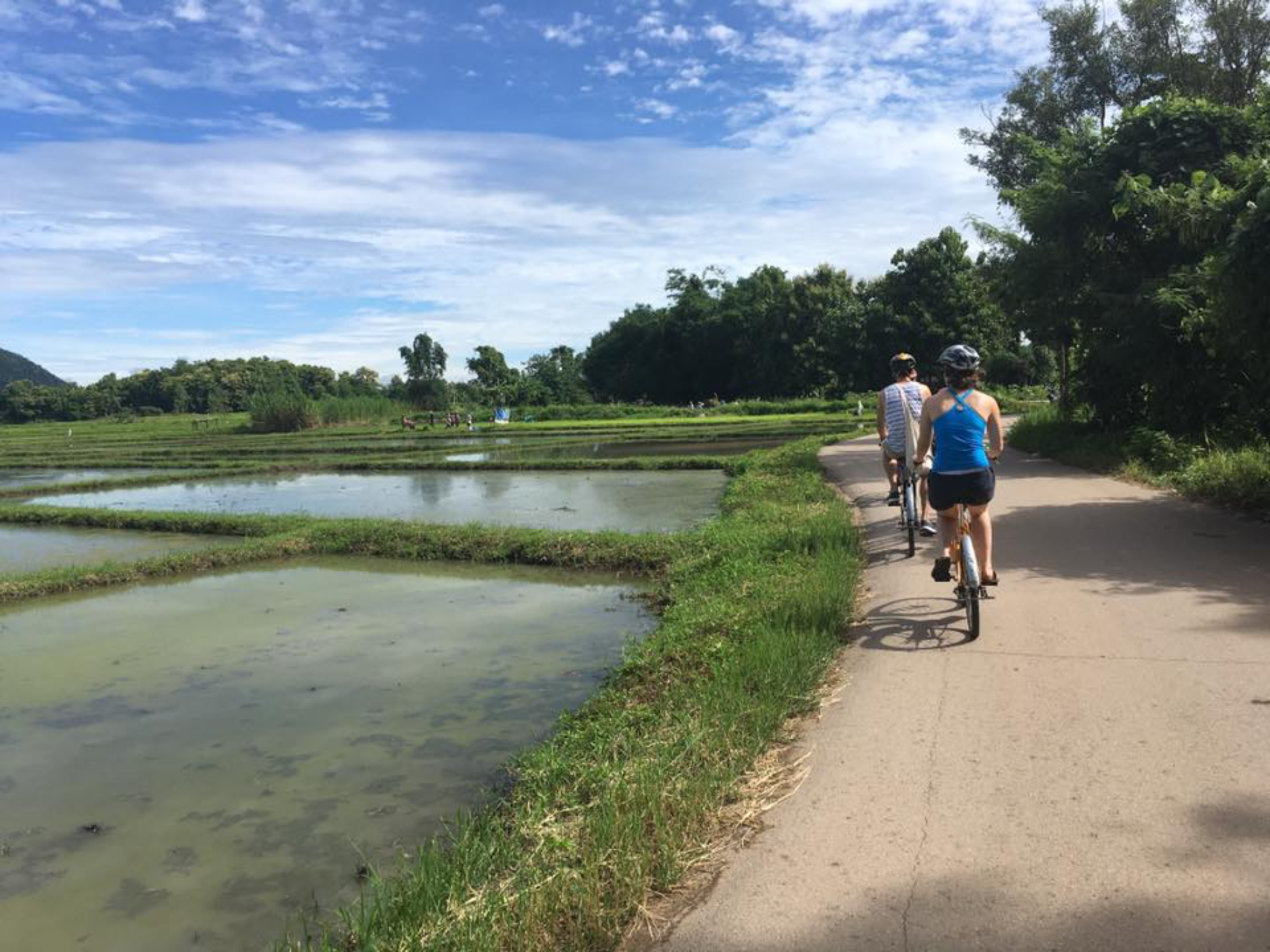 We followed Nok all around the park and stopped at various Buddha monuments. We cycled to the manager of the bike shop’s house and his daughter cooked lunch for us but on the way we saw a small dead snake with blood coming out of it by the side of the road! On arrival, we stepped into an ice cold air conditioned room after being out in the sticky heat which was the best feeling ever! We were presented with the best meal from the trip, as most home cooked meals are – Massaman potato and chicken curry, jasmine rice, deep fried chicken wings, baby corn prawn salad, pork and ginger stir fry and ginger tofu. We all tucked in and had second helpings.