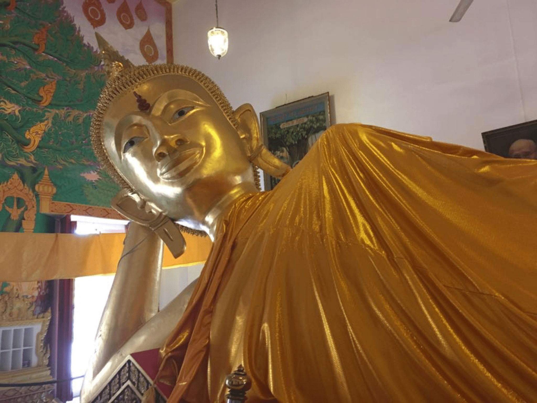 We started walking towards Lumphini park and the streets looked quite desoloute. A Thai man in very stylish yellow and pink attire with Harry Potter style rounded glasses approached us and asked us where we were going and if we were looking for advice on where to go. He seemed quite friendly and spoke English well. When we told him that we wanted to go to Lumphini park he said it was only open in the morning and was closed now. He said we should take a tuk tuk to the sleeping Buddha and then on to some shopping at a designer shopping mall nearby. We took his advice and hopped on a tuk tuk that had flashing lights in the back.