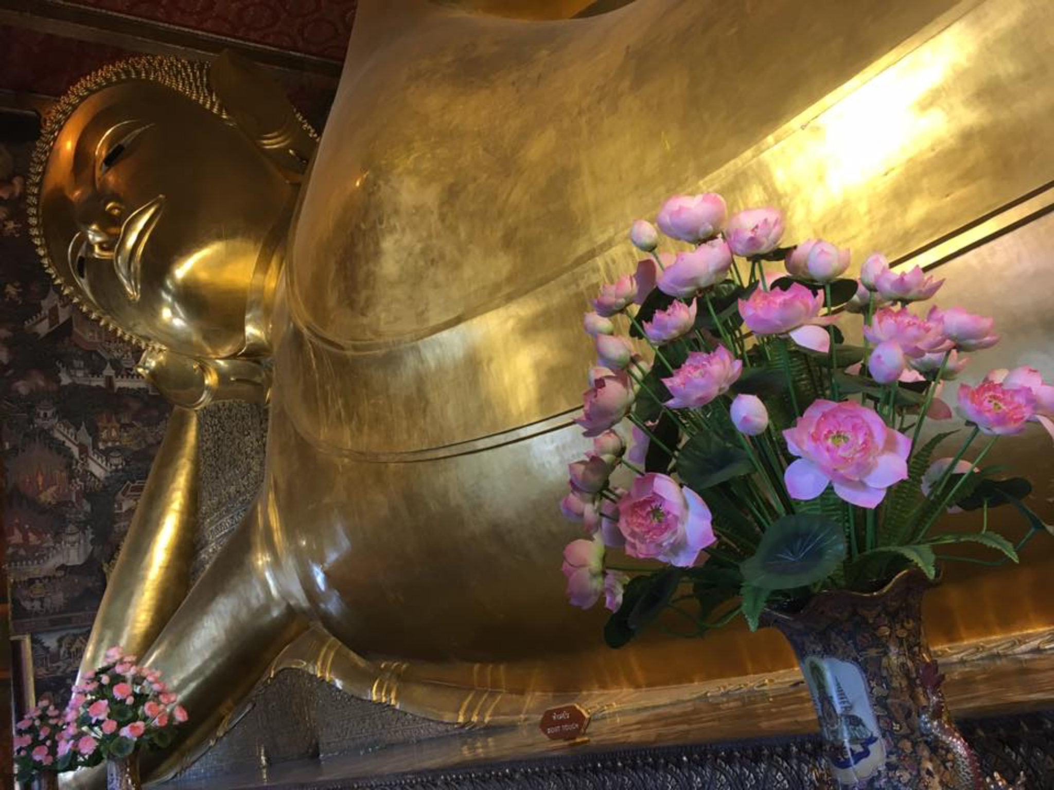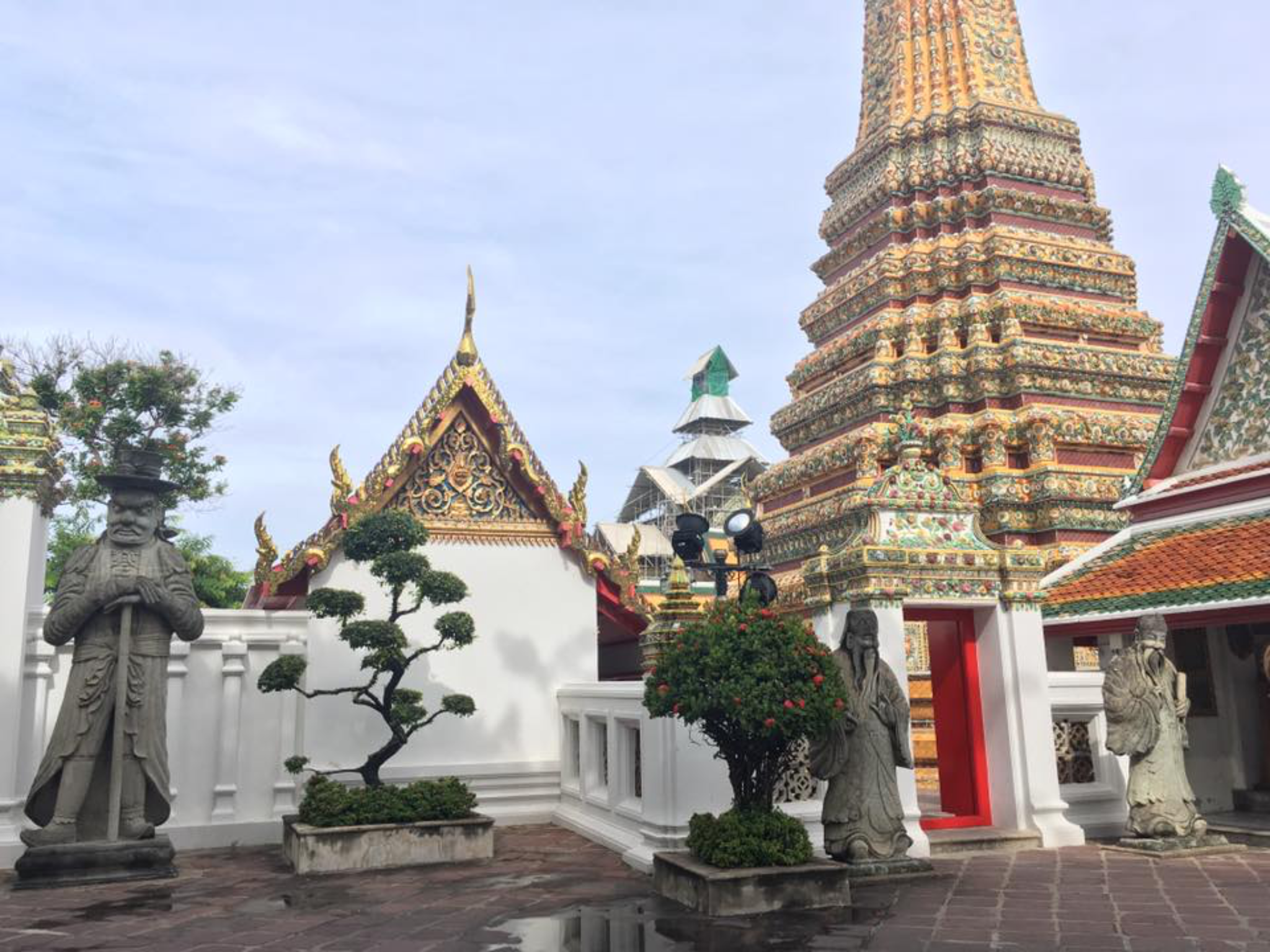 Today was our last day in Bangkok and we set off early to check out Wat Pho which houses the largest reclining Buddha in Bangkok and contains the most Buddha images in the whole of Thailand. We spent a nice morning at the temple wandering around and taking photos. We saw quite a few monks and Nok explained that in a man’s life he can become a monk 3 times. Monks eat two meals a day and help the communities they live in. Nok said that married men with families can become monks but they must take a vow of chastity and can’t live with their families for the time they decide to do that but can then go back to their families afterwards. Nok said that boys as young as 7 can become monks. It was a very hot morning and we all took turns to use Nok’s fan for relief. We also observed a lady restoring one of the buddhas by removing all the gold until the Buddha is black then restoring it by hand with gold leaves. After Wat Pho, Gavin and I had considered going to Wat Phra Kaew (The Grand Palace), where you can see the emerald Buddha and it is the former home of the Thai monarch.