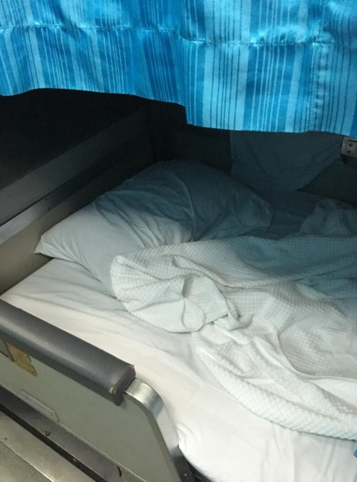 Even though the weather was very overcast, the heat was unbearably hot and we’d heard that you can be waiting in queues for hours on end so Gavin and I negotiated a tuk tuk and set off back to the hotel. We headed over the road to a bar/cafe where I had a tasty vegetarian breakfast washed down with a banana yoghurt smoothie. We then chilled out at the pool for the rest of the day with me hiding under an umbrella as I couldn’t bear the heat. We boarded the over-night train at about 18:30pm but we didn’t end up leaving until 20:10pm. It soon became apparent that we were on the old style train with the clinical looking blue curtains on the windows and beds, however we didn’t appear to have any curtains covering our window. We later were able to negotiate an extra sheet to cover the window. I decided to head for a cup of tea which was an eye-opening experience compared to the train from Chiang Mai. There were people sitting in the carriage before the cafe in seats that didn’t turn into beds, all the windows were open as there was no air-con. I was given a small cup of tea with a sachet of powdered milk and no lid. As I made my way back to my seat, I was trying to stop my tea from spilling while trying not to fall out the open doors between carriages as the train travelled at full pelt. I started watching the TV Series ‘Girl Boss’ which I’d downloaded from Netflix when we’d had semi-good wifi in Bangkok.