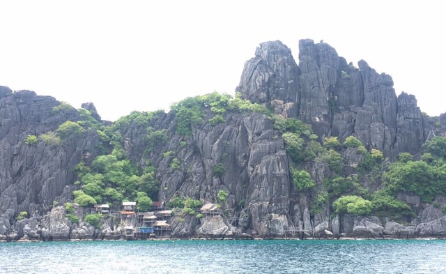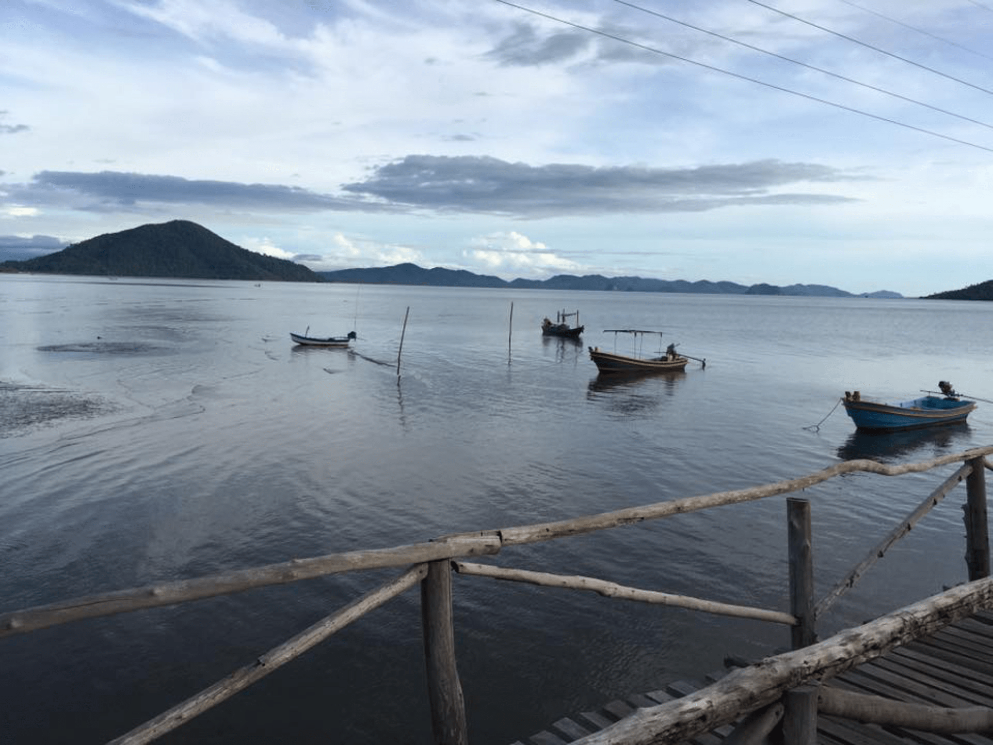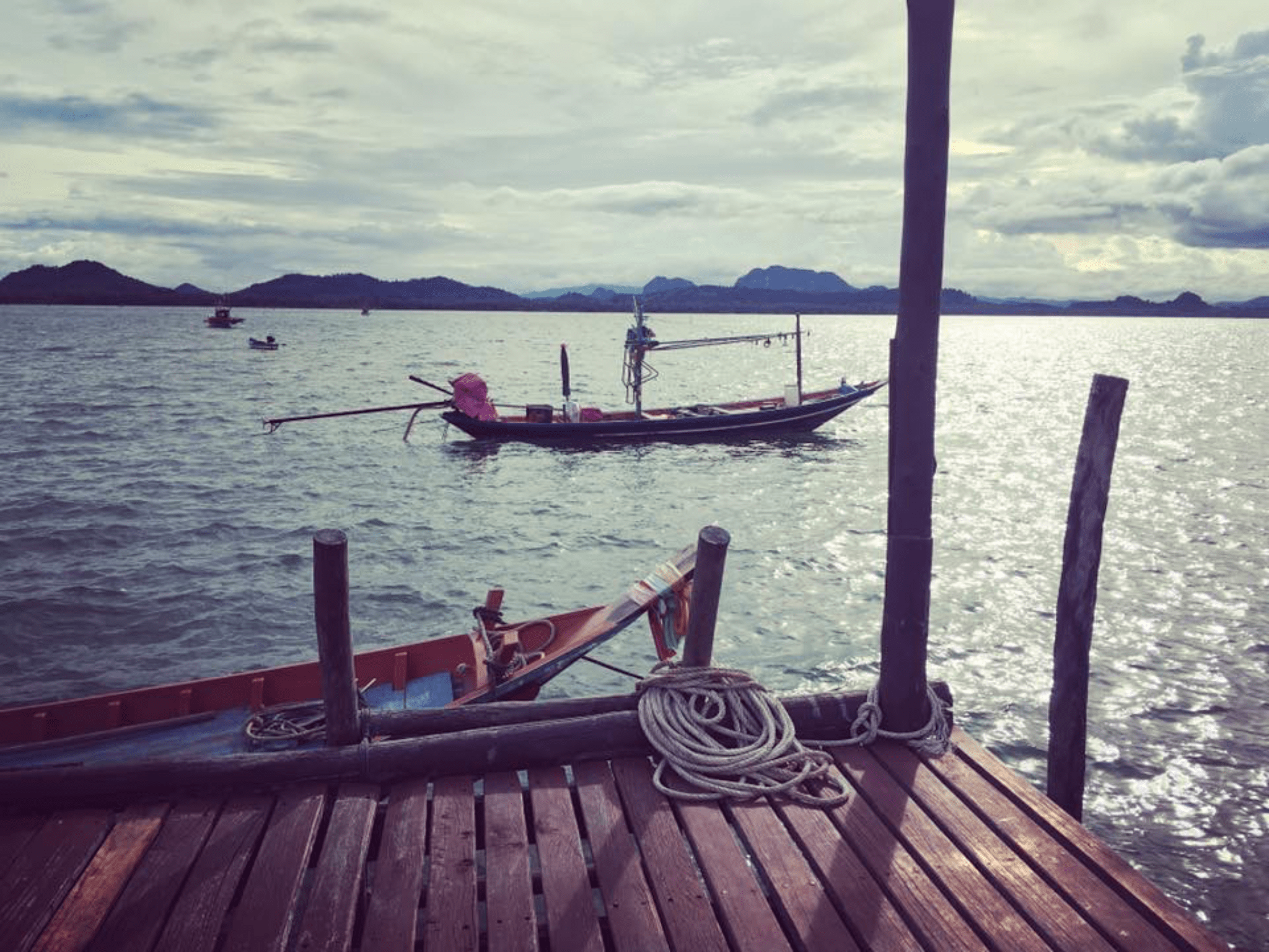 I awoke from a pretty pleasant sleep (Nok told us we should sleep with our legs facing the direction the train is going). We disembarked the train in a bit of a harassed way as I remembered there was talk of having to walk through water to get to the boat to take us to our home stay on tiny island Koh Pitak. Thus I began looking for my flip flops as I’d been wearing trainers. Just then the train abruptly stopped and we had to get off! I was getting my backpack stuck between the tiny aisles of the train but luckily I made it off in time! The first glimpse of the islands in the South made for spectacular viewing.