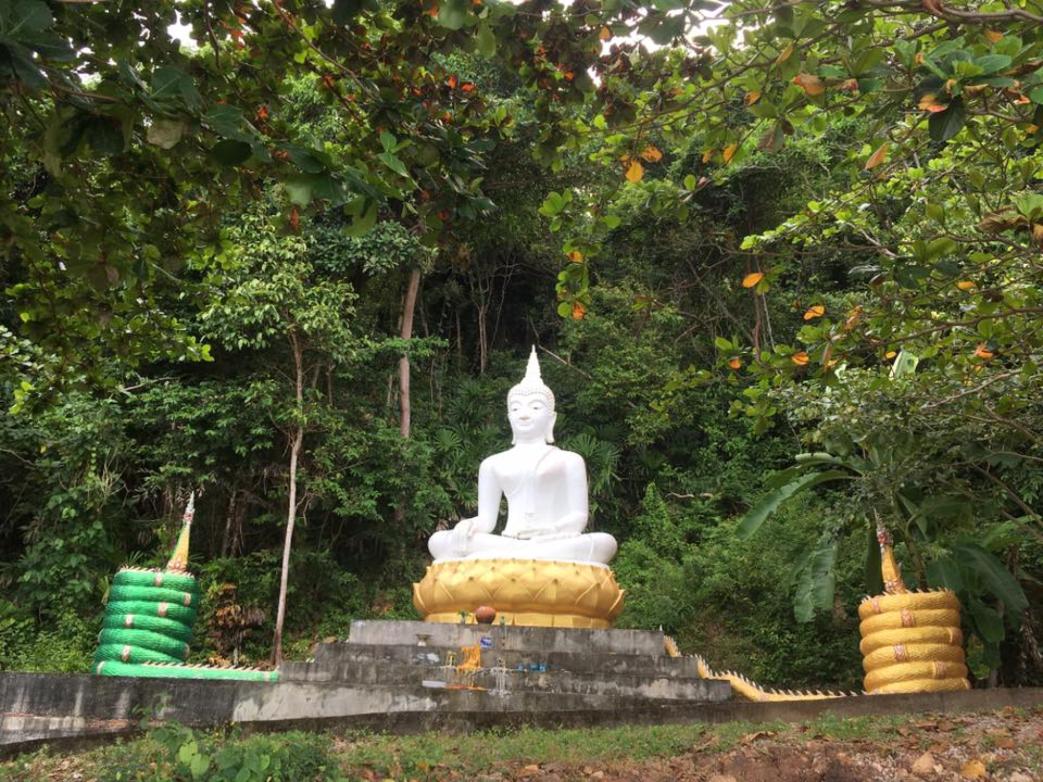 A delicious discovery at breakfast was sticky rice and custard wrapped in a banana leaf called Khan Tom. After breakfast Arne, Libby, Anna, Freddy, Flo, Andreas, Gavin and I decided to hire kayaks. The kayaks were for 2 people and we kayaked right the whole way around the small island, stopping off at a secluded beach on the mainland for a swim. The kayaking was quite hard work and when we were pushing the kayak back on to dry land, Nok warned us of a big jelly fish floating nearby, I had totally forgot about the dangers of box jelly fish but Nok reassured me that it wasn’t a box jelly fish but not to go near it anyway. The rest of the afternoon was a relaxing one, we had a lovely lunch prepared for us by the host family which consisted mostly of fresh seafood. I’m not the biggest lover of seafood but the flavours of the Thai spices in the fish soup they prepared was delicious . The rest of the day was spent walking firstly around the island with Becs then up to a viewing point and passed the statue of the Buddha at the beach with Gavin. The steps were very un-even and steep and we saw fruit growing on a tree at the top.