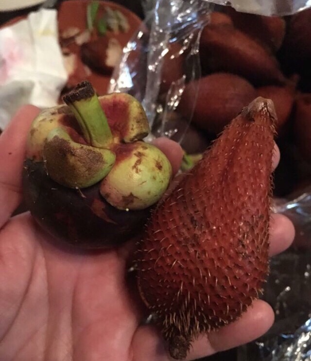After dinner Nok let us try some local fruit – Mangosteen (the round dark purple & green one) and Salacca, also known as ‘snake fruit’ because of its snake like exterior.