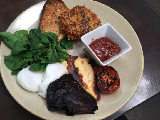 Next up is my scrumptious veggie breakfast which included a crispy potato rosti, 2 poached eggs, mushrooms, grilled tomato, spinach, a slice of toast and grilled halloumi, accompanied with a tomato relish for dipping. Halloumi seems to be somewhat of a firm favourite on the breakfast menus in Australia and it didn’t disappoint!
