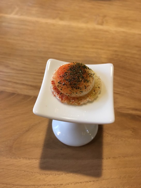 The canapés were stunning to look at and very tasty on the palate. Firstly I tasted the butternut squash with furikake and spring onion oil, the balance of crunch to the butternut purée was really something special. Second I tried the crispy lamb belly with basil emulsion and capers, the consistency of the lamb was cooked to perfection. Lastly I tasted the caprese explosion which was so delicate, all the flavours melted in my mouth.
