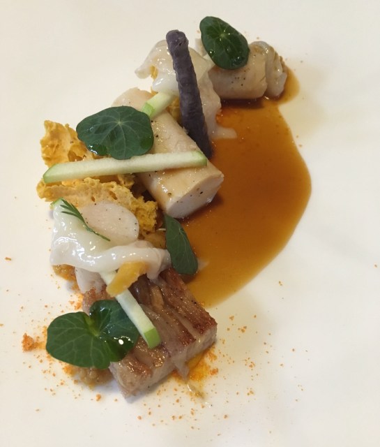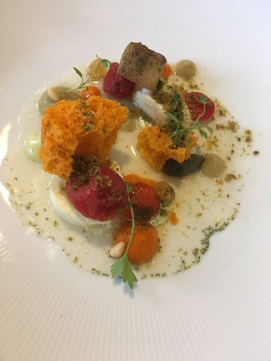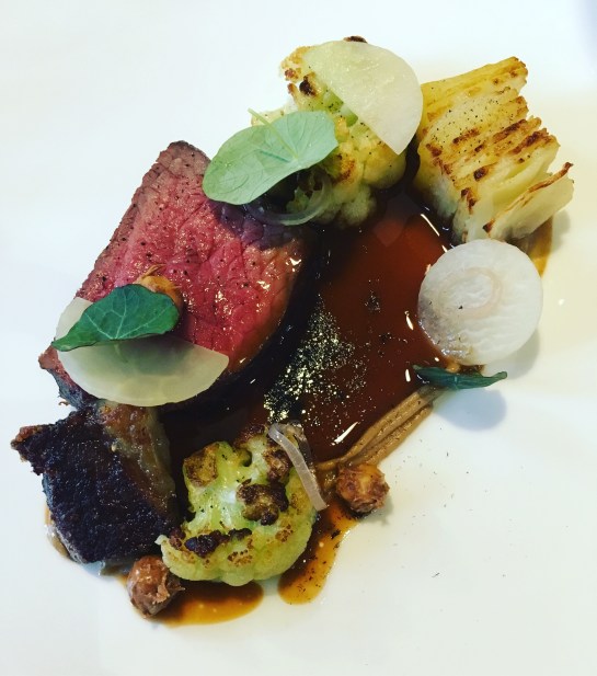 To start there was a choice between Baked Ricotta – pine nuts, peppers, aubergine, olives and tomato or Rabbit Loin – lardo, nasturtium, carrot and mustard seeds. I personally chose the Ricotta and loved the balance of flavours and the contrast of colours, the food that was presented is the kind of dishes I would like my students to see in terms of garnishing and making a plate of food stand out and be attractive to the eye, it was stunningly presented. Equally the rabbit loin looked so pretty on the plate.