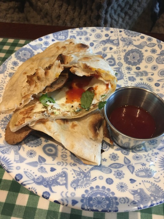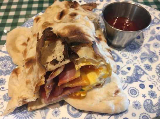 So one spontaneous Saturday morning I went to check them out and I wasn’t disappointed! The layout of the restaurant feels like you are on an old train in India! The menu is extensive and there is so much to choose from. Their full breakfast – The Big Bombay and their date and banana porridge sounded incredible. However I came for the naan roll and that’s what I had, a bacon and egg naan to be exact and my boyfriend went for the sausage and egg one! They are just thee best creation ever, accompanied by a spicy tomato sauce that I’d love to buy a bottle of!