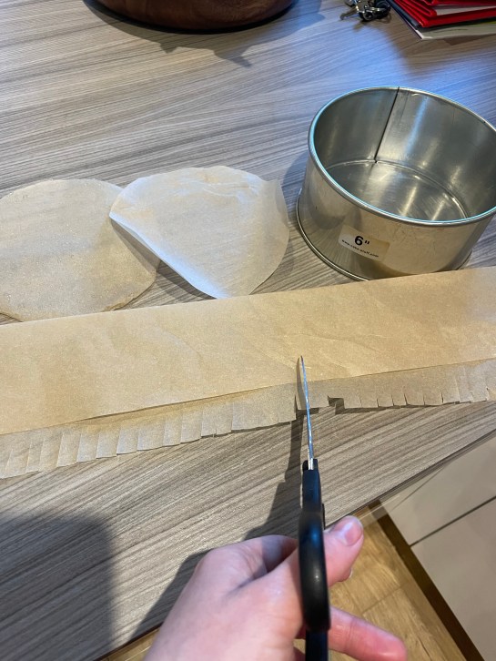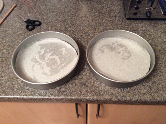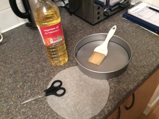 Start by drawing around the base of your cake tins on greaseproof paper X2 and greasing with oil, the base, sides and on top of the greaseproof circles. I bought my tins from Lakeland, they are approx 22cm wide and 4cm deep and they are so handy for any kind of cake. However I have used 2 X 6 Inch cake tins with high edges, I’ve cut fringes on the paper and ensured the paper is the height of the tin. Then flattened the fringes down inside the tin and placed the square / circle on top and greased the paper to make sure it doesn’t stick to the cake.