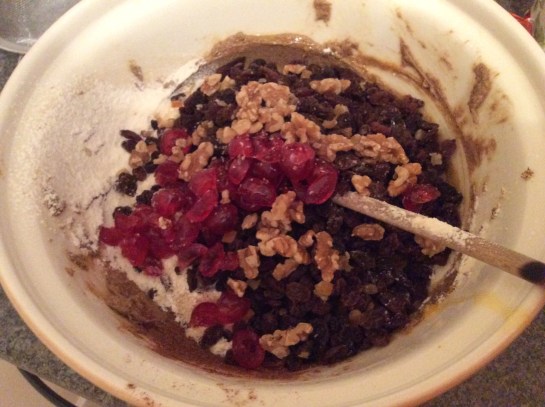 Add the dried fruits, cherries (toss them in some flour and half them beforehand) mixed peel and walnuts (break them up slightly).