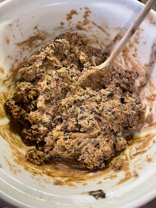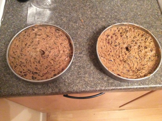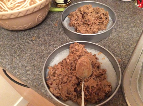 I add a dash of Brandy for a bit of extra Christmas body to the cake, if you make your cake in enough time you can top it up with brandy every other day, as it will soak into the baked cake. Evenly disperse the cake between the 2 tins (I always make 2 cakes to fill my 2 cake tins but you can adjust the recipe accordingly).