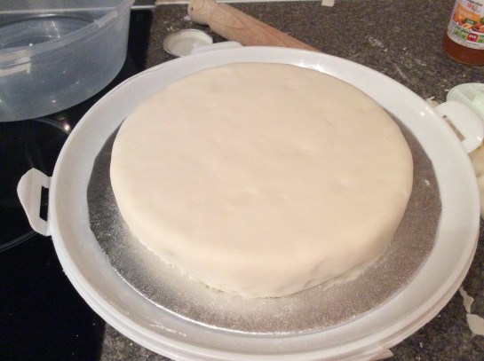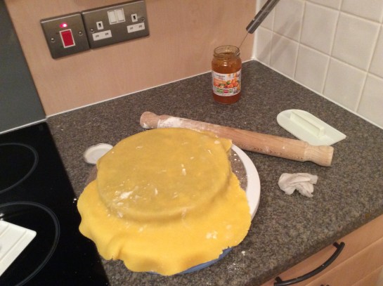 Once you have spread the jam on the cake, clean your workspace and sprinkle on some icing sugar or cornflour and knead the marzipan, ensure you keep reapplying icing sugar/cornflour so as you can roll the marzipan evenly and cover the cake. Use a smoothing tool to eliminate any lumps and do the same thing with the sugar paste of your choice.