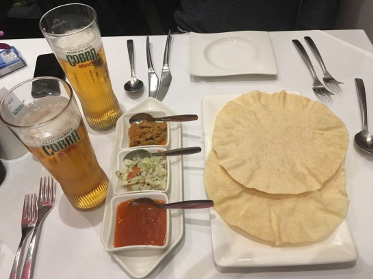 Thursday night and I can smell the weekend and it’s about this time in the week that I think I’m definitely due a treat. A large Cobra beer accompanied by some crispy poppadoms and a lime pickle, spiced onion, mango chutney assortment is how I define happiness. We were warmly greeted and promptly seated as we entered Voujon and I had a beer in my hand within minutes which always makes me happy. Voujon is the kind of restaurant that I enjoy coming to midweek, somewhere you can relax and unwind after a busy day. The decor was clean and modern and the tables were set-up with crisp white tablecloths.