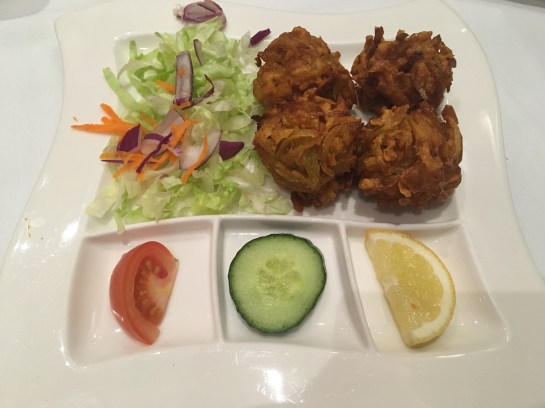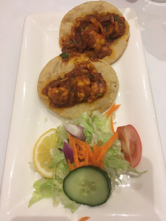 Our starters were phenomenal! We went for the generic vegetable pakora which we both like and we both shared the King Prawn Parthia with Puri – King Prawns in a subtle sauce on top of fried puffed bread garnished with fresh coriander, served with a side salad, it was unbelievably tasty, the prawns were soft and flavoursome and what’s not to like about puffed fried bread?! Delicious and gobbled up within seconds!