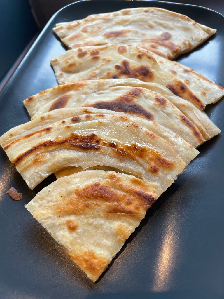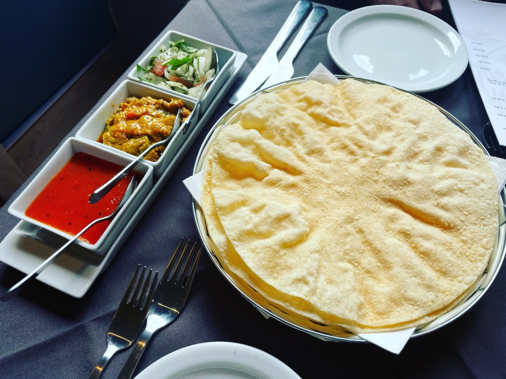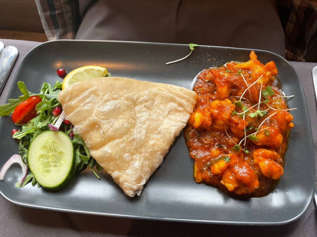 I’d always been on at Gavin to try something other than plain naan bread so I ordered the paratha – fried layered whole wheat bread which sometimes contains potatoes (aloo). Gavin said he thought it looked like a tattie scone which I had never thought of before! All the same, it tasted good as a different option to naan bread for dipping into all the succulent flavours of the curry sauces.