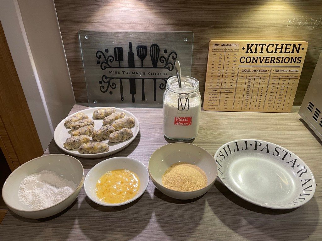 4. Coat the croquettes in the flour, then the eggs then roll in the breadcrumbs until fully covered.