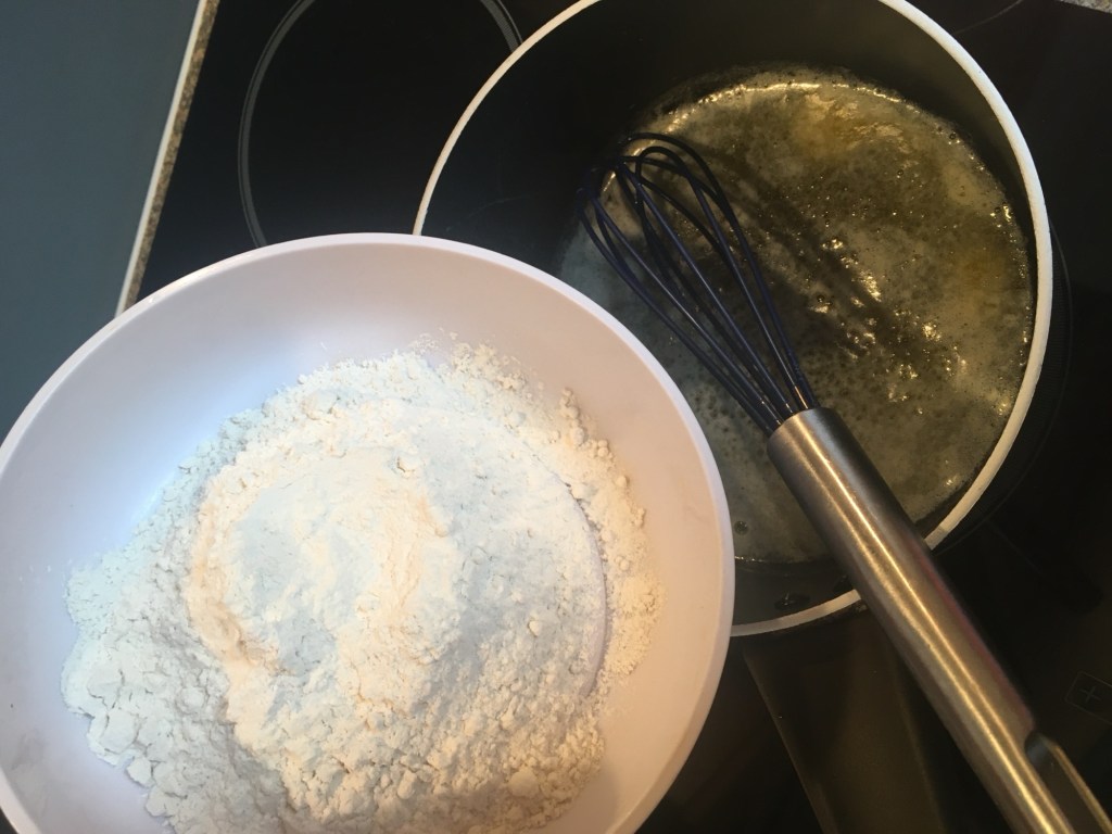 1. Melt 75g butter in a pan and whisk in 100g plain flour.