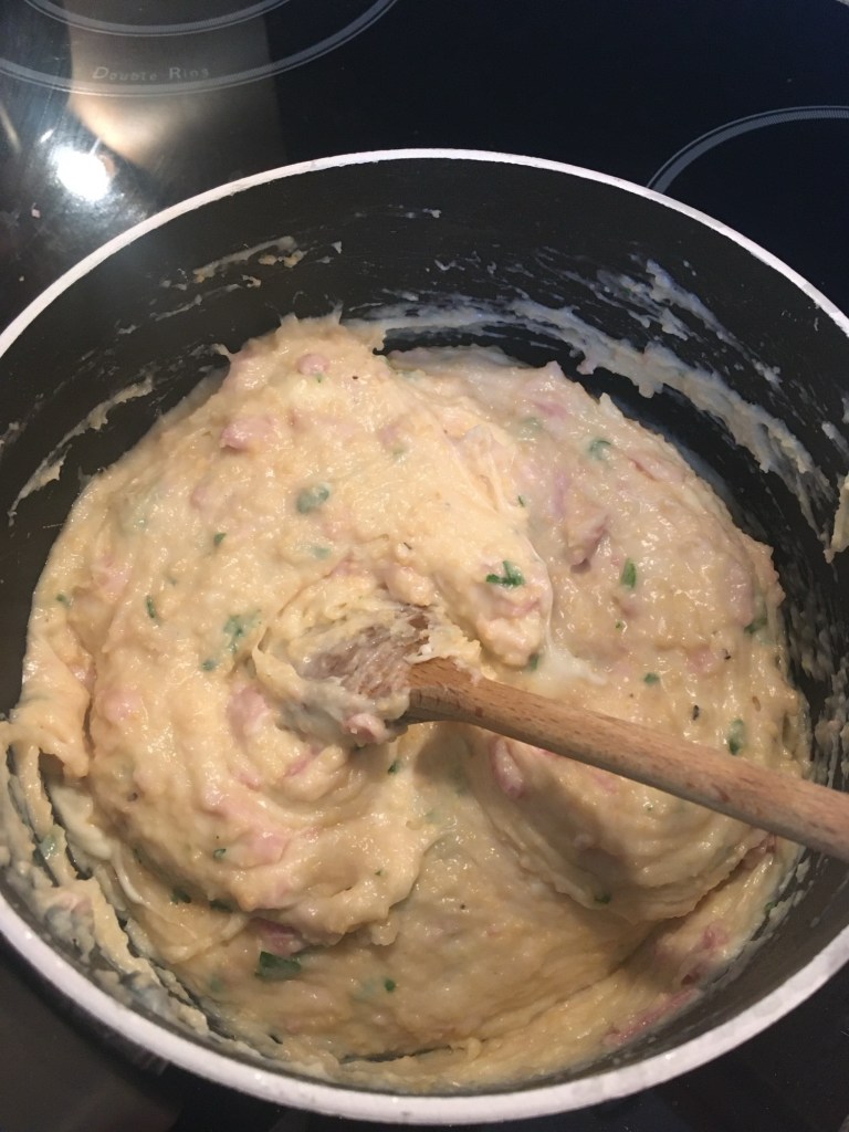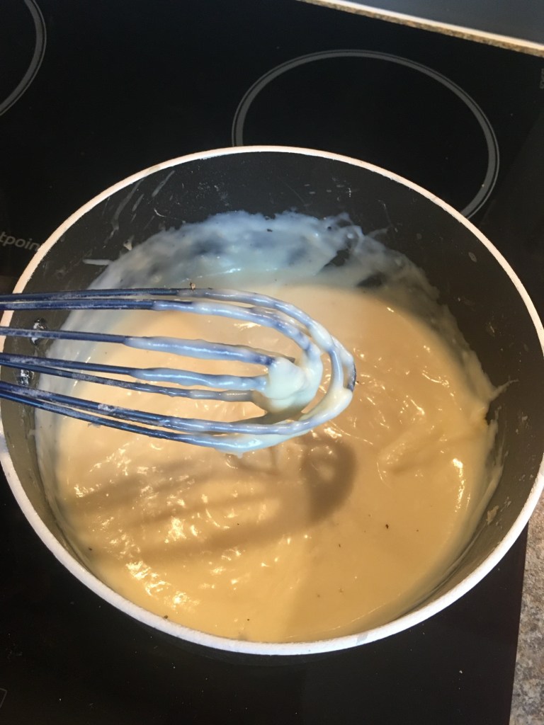 2. Over a gentle heat, gradually whisk in 500ml milk until you have a very thick white sauce (similar to when making macaroni cheese).