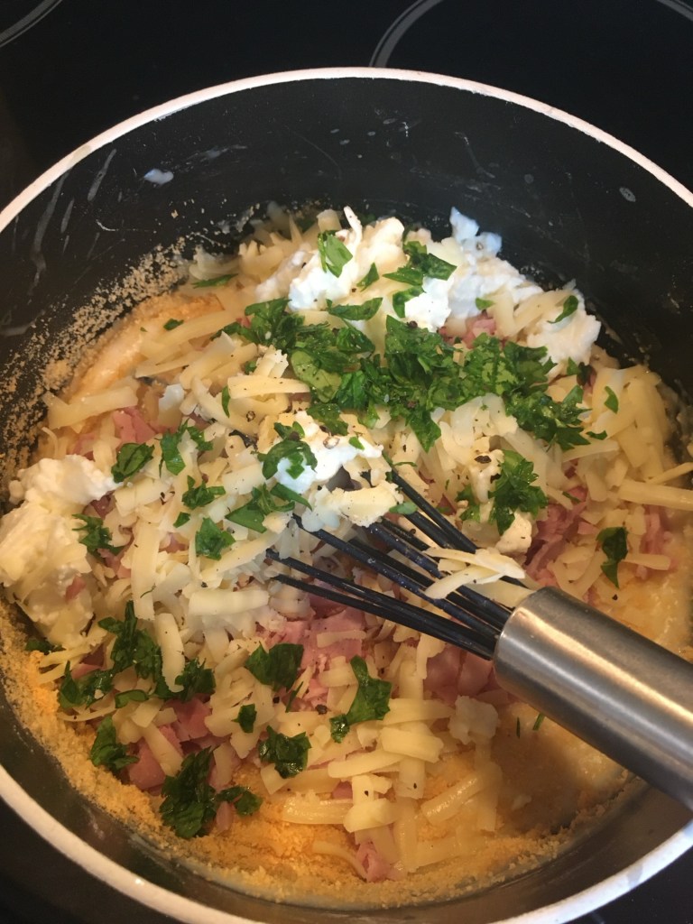 3. Add 50g breadcrumbs, 90g chopped ham, 50g grated cheddar, 50g torn mozzarella and 2 tbsps chopped parsley and stir until melted. Chill for 4 hours.